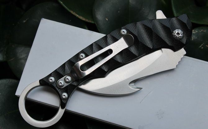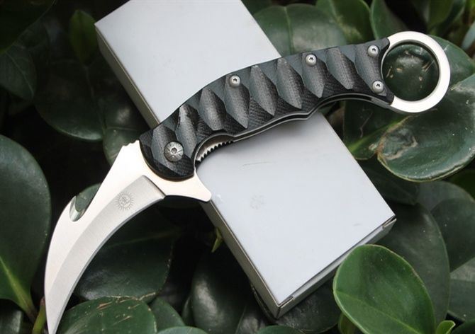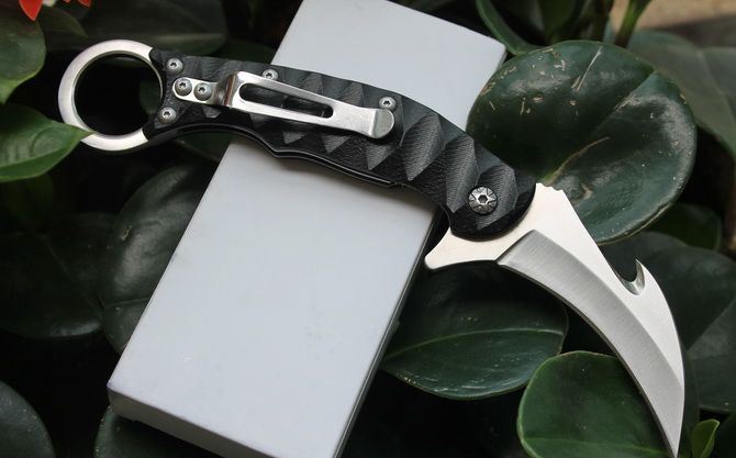漠江极速魔爪快开折刀 全长:19cm 刃长:7cm 刃宽:2.5cm(最宽处) 刃材:9Cr18 硬度:57HRC 刃厚:0.48cm 柄长:10cm 表面:拉丝 柄材:G10 重量:110克