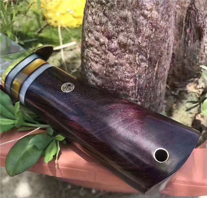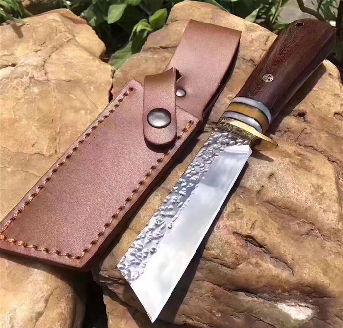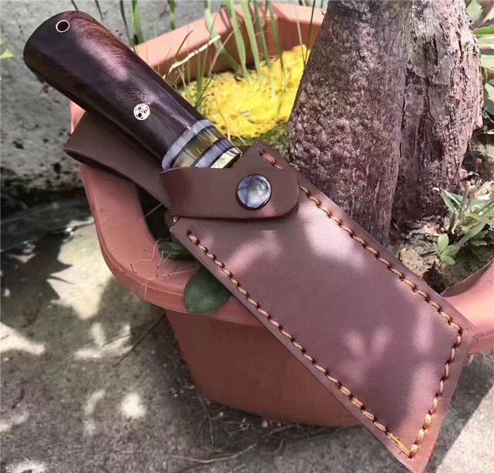 花梨木大柴刀镜光款大马士革直刀 全长:240 刃长:120 刃材:440C镜面 刃厚:3.5 硬度:58 刀柄:花梨木 配皮套