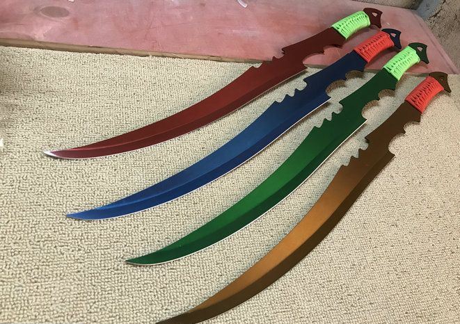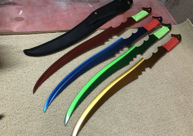 邪神忍者刀 全长:71.5cm 刃长:53cm 柄长:18.5cm 厚:3mm 钢材:3cr13 重量:600g(含包装)净重:505g 手柄:夹片绑绳 刀套:帆布套 包装:配纸盒