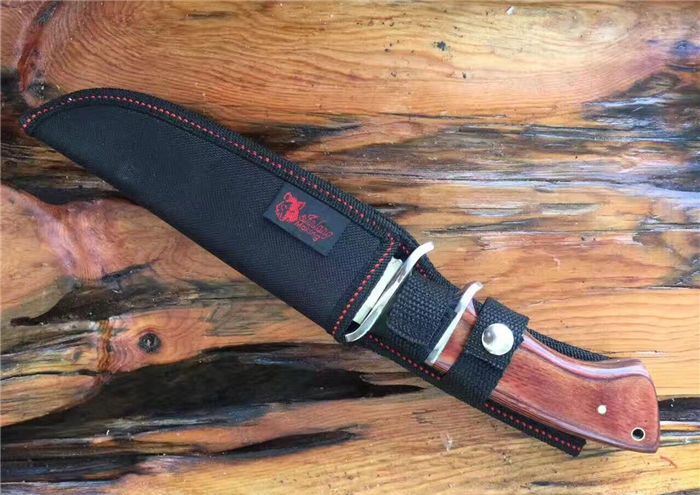 全 长:31.5cm 刃 长:18cm 刃 宽:3.6cm(最宽处) 刃 厚:3.9mm 柄 长:13.5cm 表 面:拉丝+镜光 刃 材:3CR13 硬 度:57HRC 柄 材:双钢头雕花+进口彩木 重 量:376克(含包装) 包 装:尼龙套