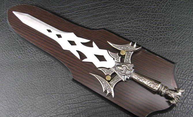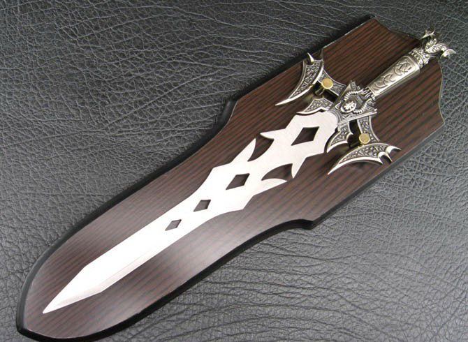 欧式仿古装饰战神-D8B挂剑 剑长:38厘米, 剑刃最宽处:3.7厘米, 刃厚:0.3厘米, 净重:310克 材质:高级不锈钢 剑身:开孔古典花纹 剑柄:欧式仿古 此剑用精钢制造,剑形古典庄重, 质量上乘, 未开锋,纯粹为工艺收藏品。 置于家中气度非凡,是装点家居、馈送亲朋好友的最佳礼品,而且此剑有辟邪镇宅之用。