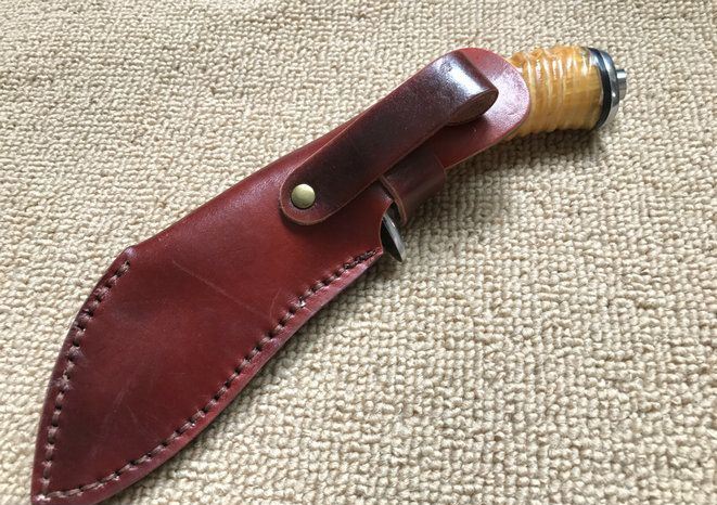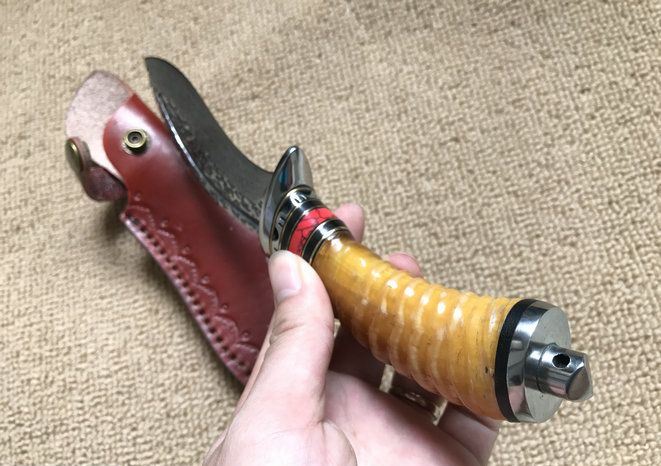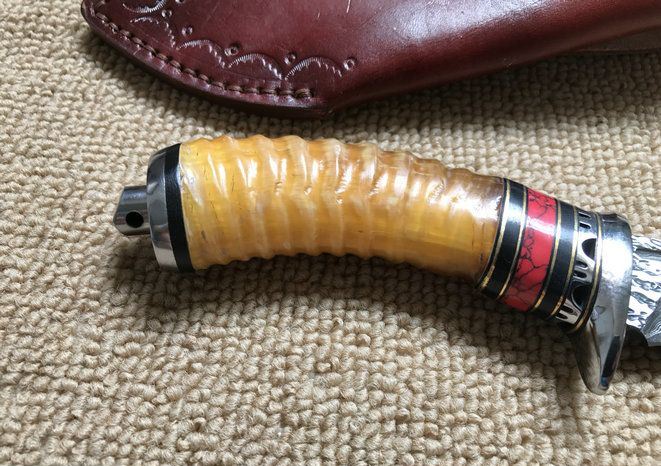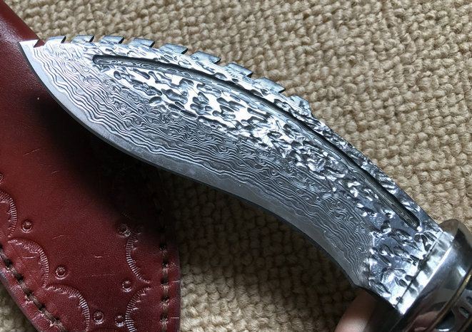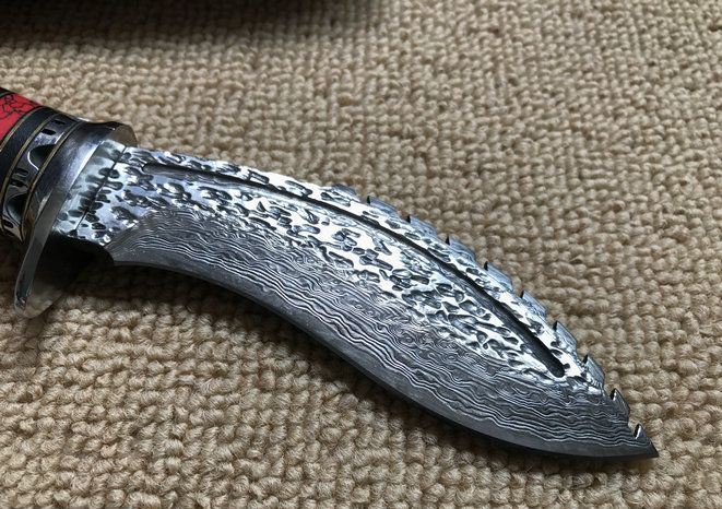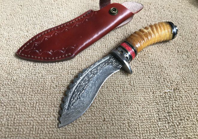 血狼大马士革狗腿刀 全 长: 22.1cm 刃 长: 10.8cm 柄 长: 11.3cm 刃 厚: 4.2mm 刃 宽: 3.9cm 刃 材: 正品进口Vg10大马士革 硬 度: 59-60HRC 重 量: 约390克(含包装) 表 面: 锻打祥云花纹原色 柄 材: 天然羊角+雕花不锈钢+黄铜+G10 配 送: 高级礼品盒+原装高档皮套