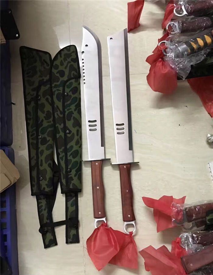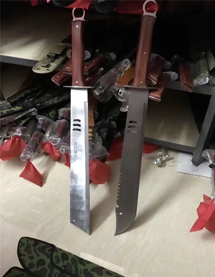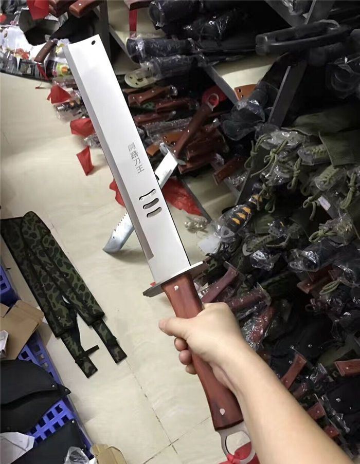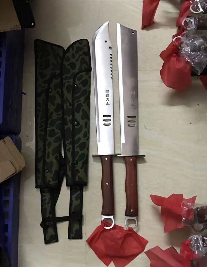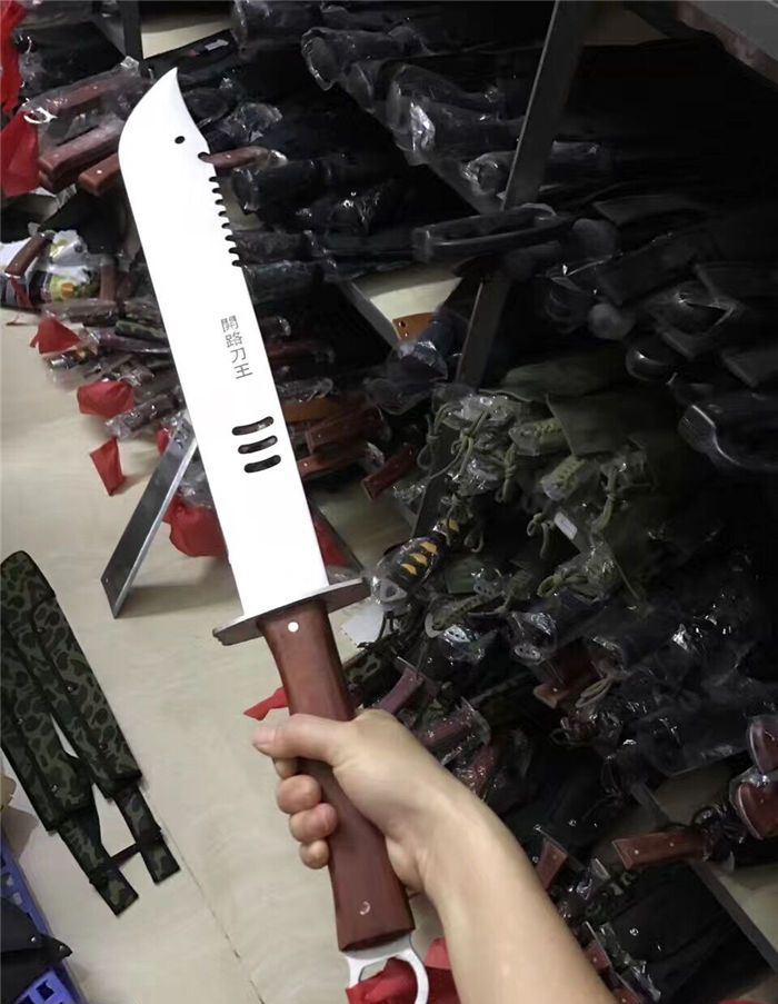 开路刀王 全 长: 68cm 刃 长: 42cm 刃 宽: 7cm(最宽处) 刃 材: 420 硬 度: 56 表 面: 砂光 刃 厚: 0.32cm 柄 长: 21.5cm 柄 材: 原木 重 量: 950克尼龙鞘