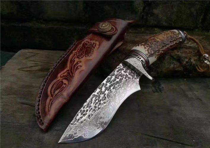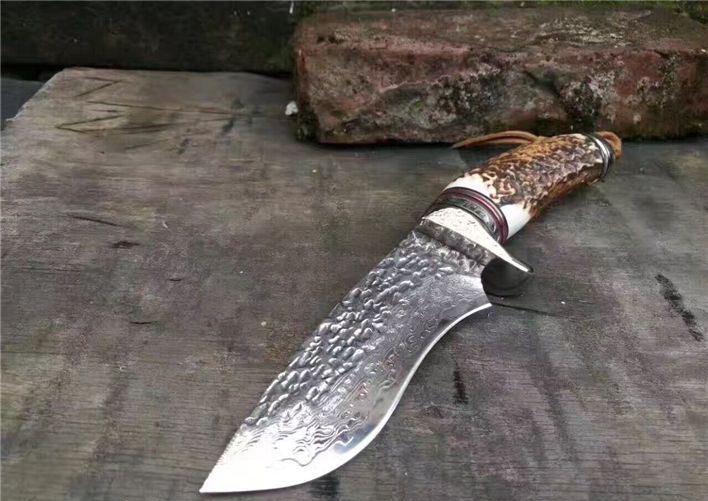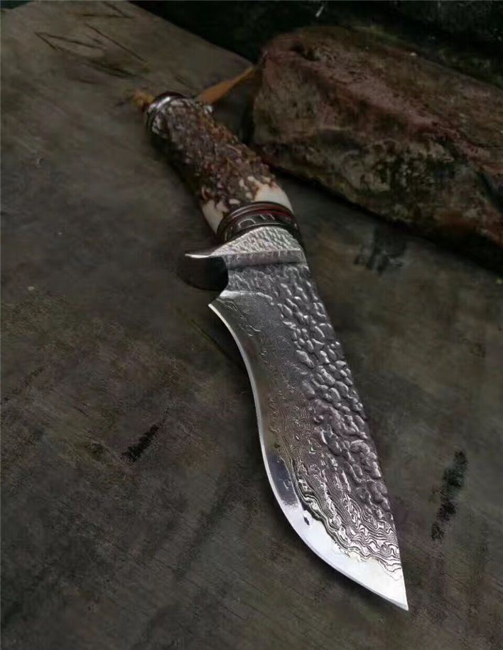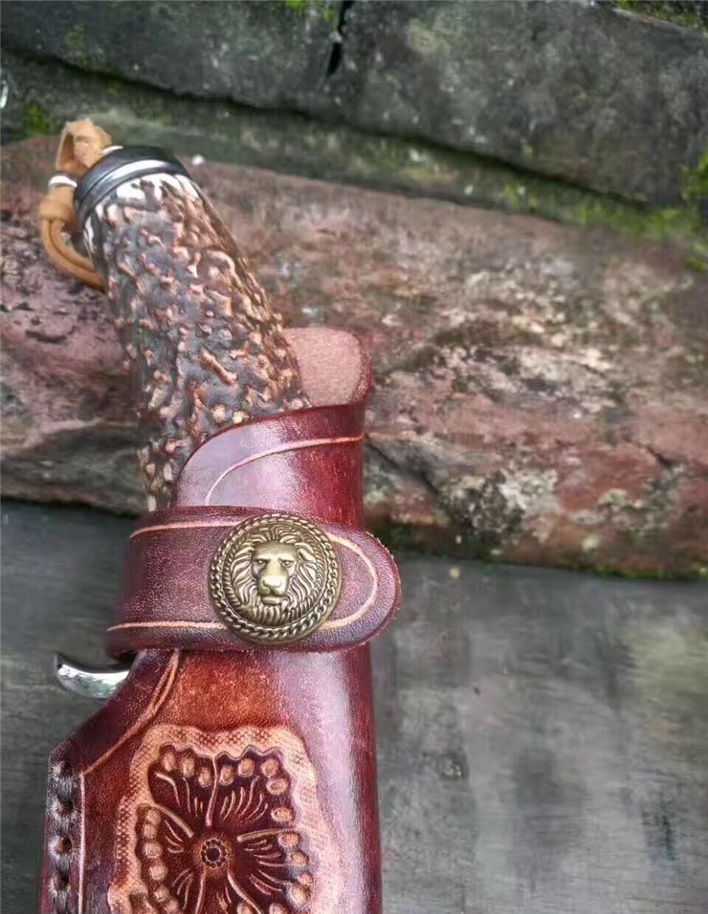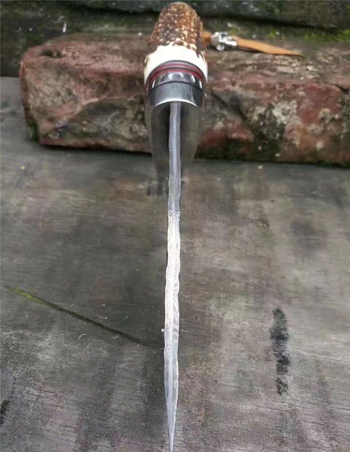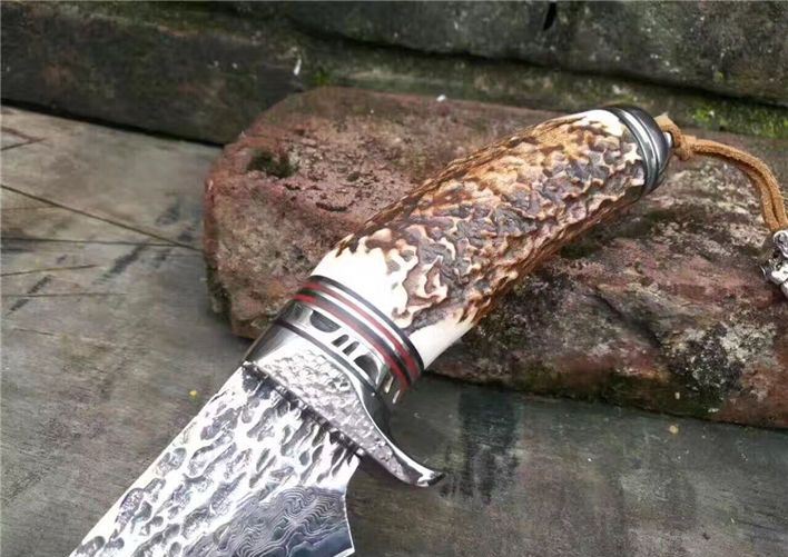 手工作大马士革鹿角野狼猎刀 全长:230mm 刃长:120mm 刃厚:4.3mm 刃宽:36mm 柄长:110mm 刃材:进口VG10芯层大马士革钢 净重:约255g 硬度:58-59hrc 柄材:天然鹿角 皮套:手工进口植鞣牛皮鞘 包装:高档礼盒