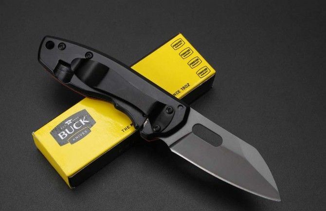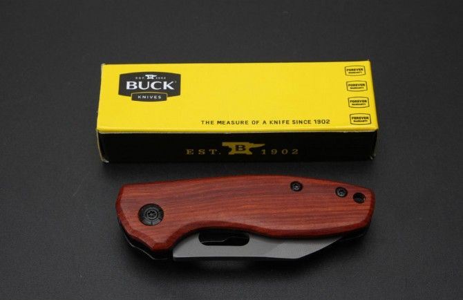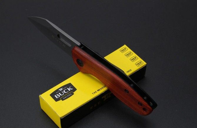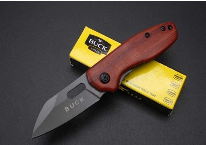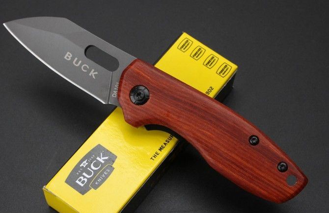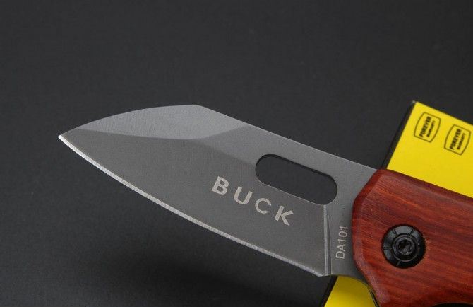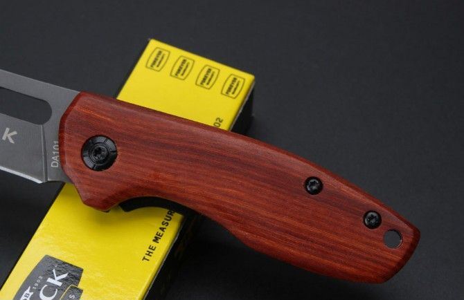 巴克DA101折刀 全长:14.3cm 刃长:5.5cm 柄长:8.5cm 刃宽:2.2cm 刃厚:0.3cm 刃材:440 重量:78g(含包装) 硬度:58HRC 表面:灰钛 柄材:钢+酸枝木. 锁型:侧锁 其他:彩盒