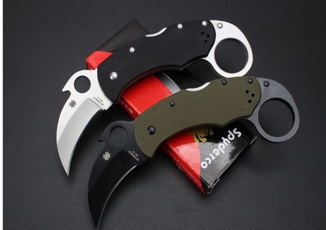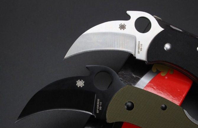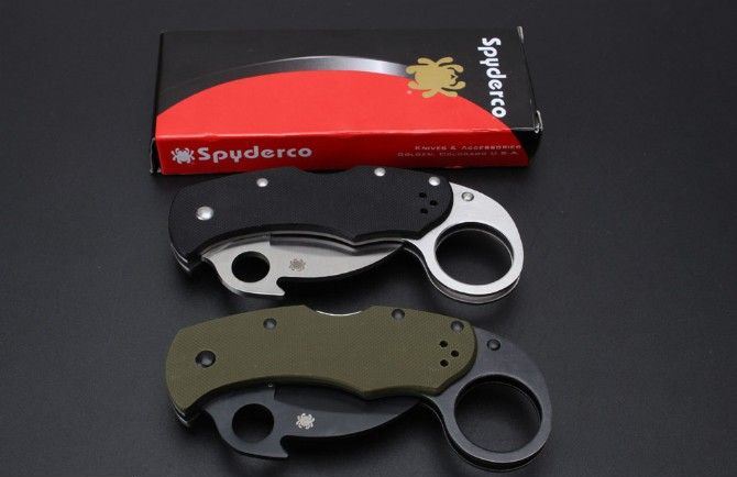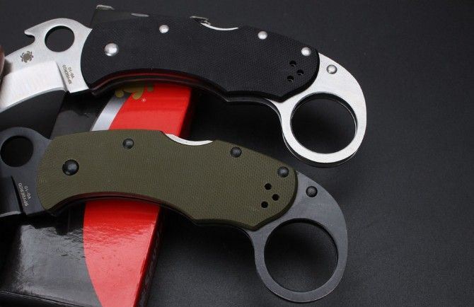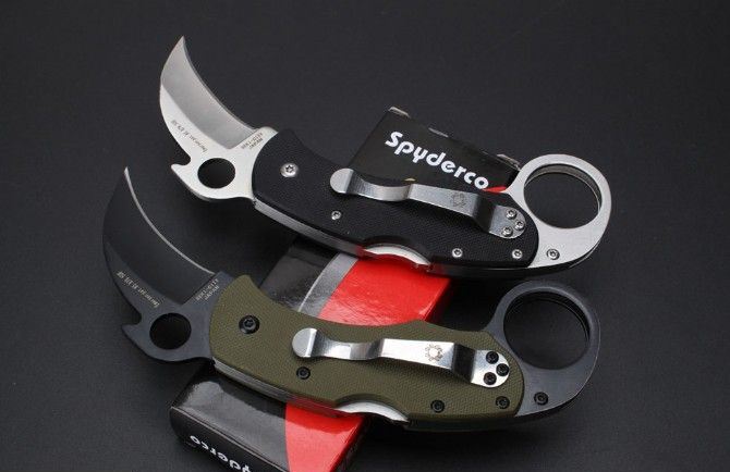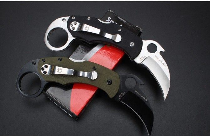 蜘蛛VG10爪子刀 全长:170mm 刃长:50mm 柄长:115mm 刃宽:30mm 刃厚:2.8mm 刃材:VG-10 重量:120g(含包装) 硬度:59HRC 表面:砂光+黑钛 柄材:G10 锁型:背锁 其他:配彩