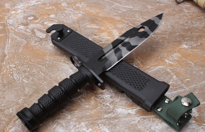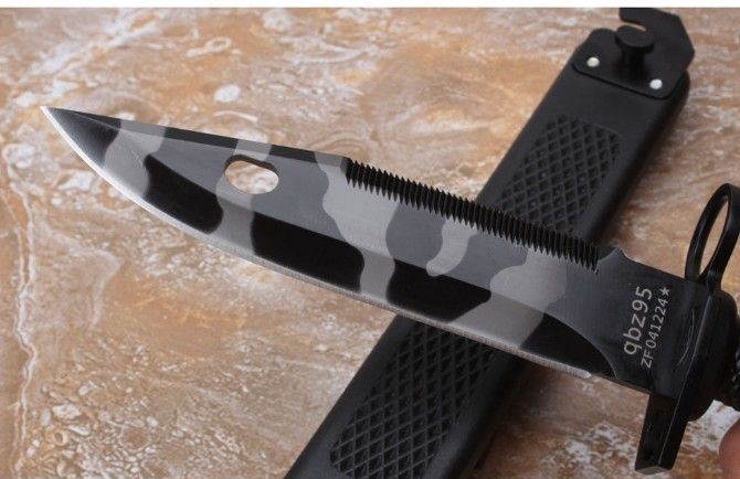 高仿95军刺三款 全长:29.8cm 刃长:17.8cm 刃厚:0.55cm 净重:390克 毛重:536克 刃宽:3.4cm 刃材:5Cr13Mo 硬度:56-57HRC