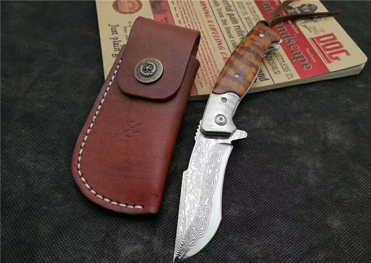 猎豹王者大马士革折刀 全长:20cm 刃长:8.5cm 刃宽:3cm 刃厚:3.8mm 钢材:日本夹层大马士革钢(钢芯层VG10)78层,真空深冷热处理, 开刀方式:单手快开 轴承:进口纯铜轴承 钢头:大马士革钢 柄材:进口名贵蛇纹木!背骨雕花,配皮绳子 皮套:进口植鞣皮手工缝线 盒子:硬盒子礼盒包装