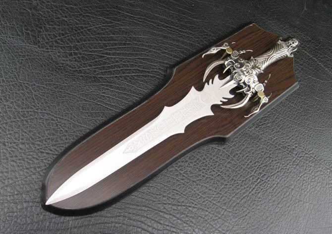 欧式战神-D5B仿古装饰小型挂剑 剑长:39厘米, 剑厚:0.3厘米, 剑身净重:440克 材质:高级不锈钢 剑身:雕刻古典花纹 剑柄:欧式仿古 配壁挂式剑座 此剑用精钢制造,剑形古典庄重, 质量上乘, 未开锋,纯粹为工艺收藏品。 置于家中气度非凡,是装点家居、馈送亲朋好友的最佳礼品,而且此剑有辟邪镇宅之用。