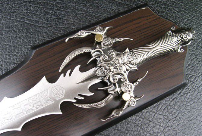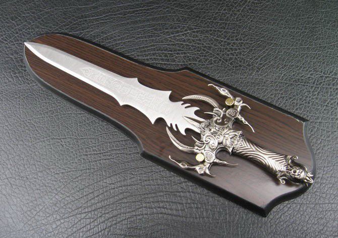 剑长:39厘米, 剑厚:0.3厘米, 剑身净重:440克 材质:高级不锈钢 剑身:雕刻古典花纹 剑柄:欧式仿古 配壁挂式剑座 此剑用精钢制造,剑形古典庄重, 质量上乘, 未开锋,纯粹为工艺收藏品。 置于家中气度非凡,是装点家居、馈送亲朋好友的最佳礼品,而且此剑有辟邪镇宅之用。