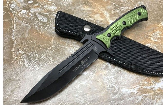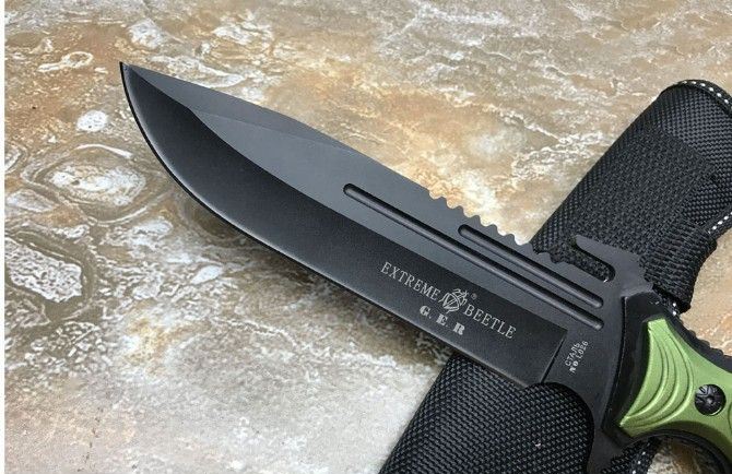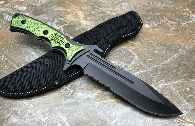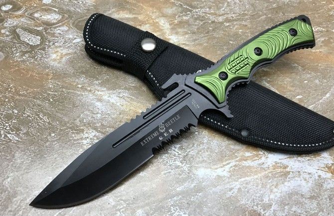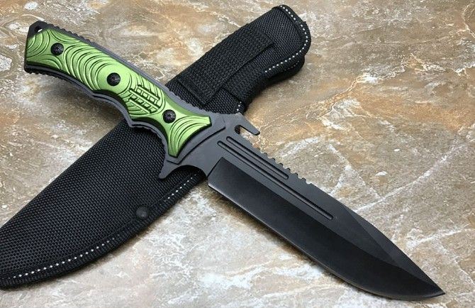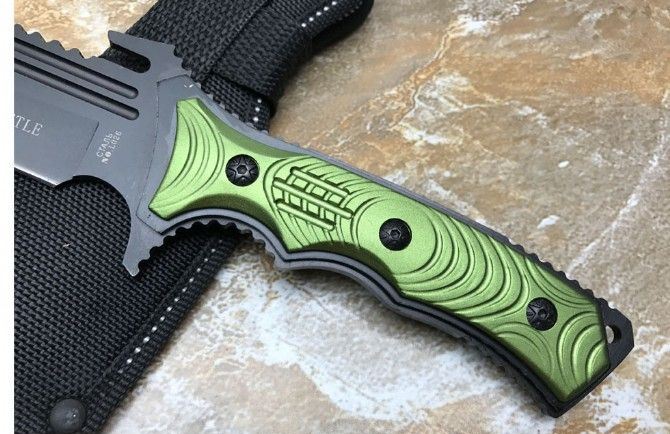 KL0269铝柄守猎刀 全长:291mm 刃长:15.5mm 柄长:14.0mm 刃宽:43mm 刃厚:3.5mm 刃材:5c13 柄材:钢一体柄+铝柄条 硬度:56HRC 表面:黑钛 重量:453g(含包装) 其他:配牛津套