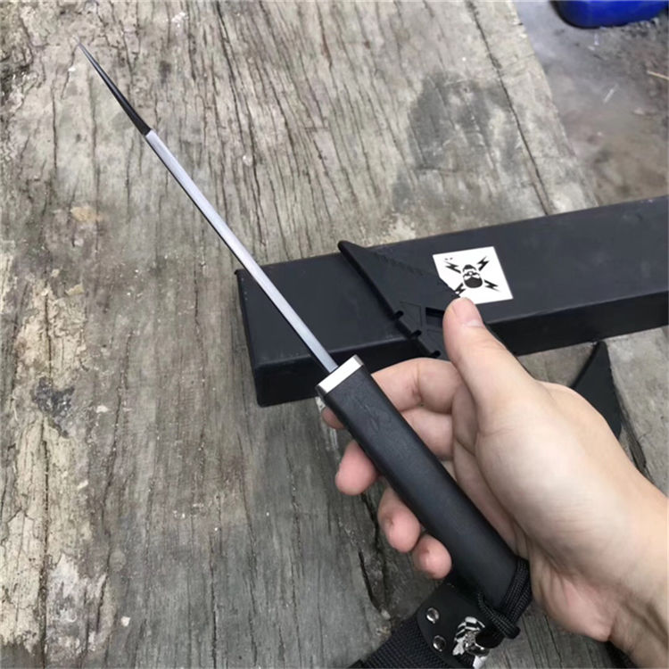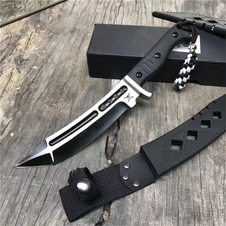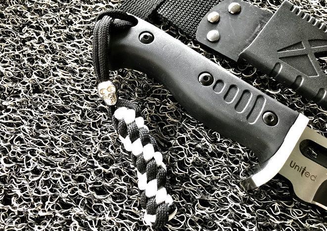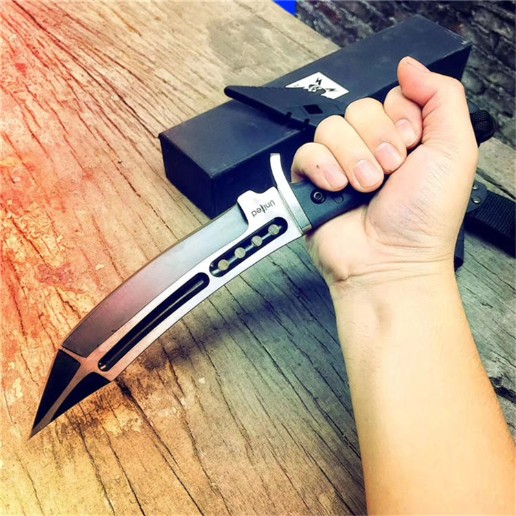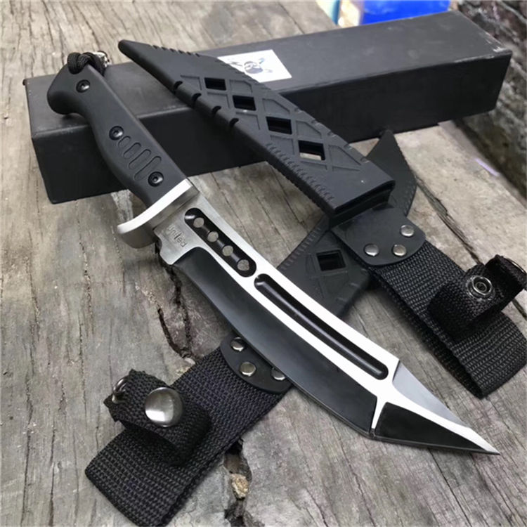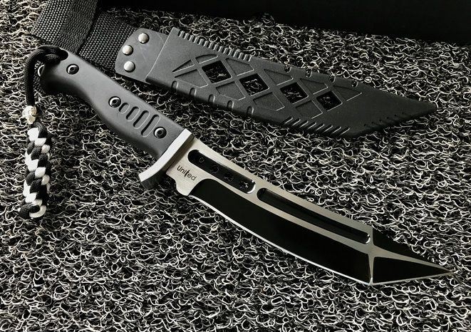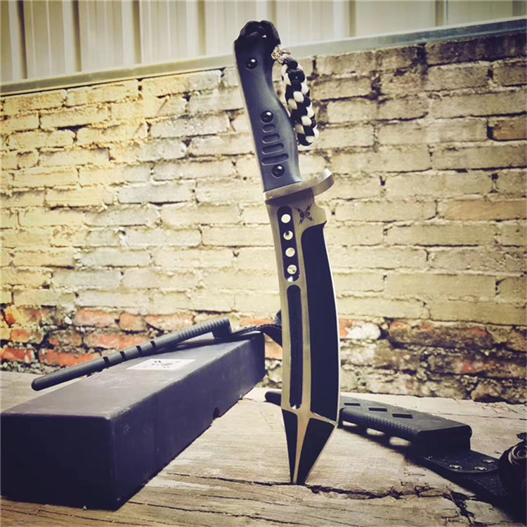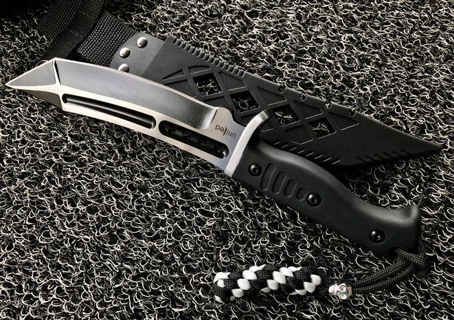 新款United联合刀具探界者直刀 全长:30cm 刃长:18.2cm 刃宽:3.6cm 刃厚:0.5cm 柄长:10.7cm 刃材:9Cr18M0V 表面:镀钛+拉丝 硬度:58-60HRC 柄材:ABS 鞘材:ABS 刀重:293克