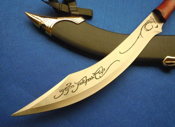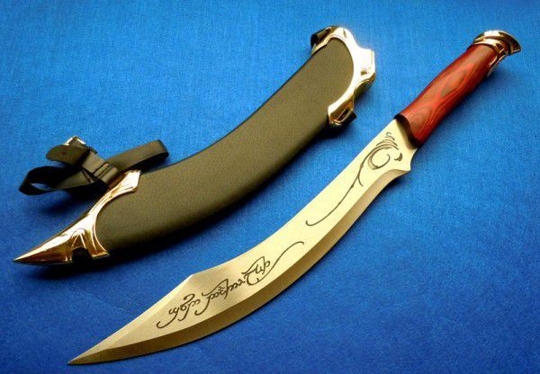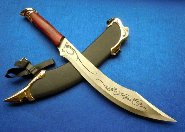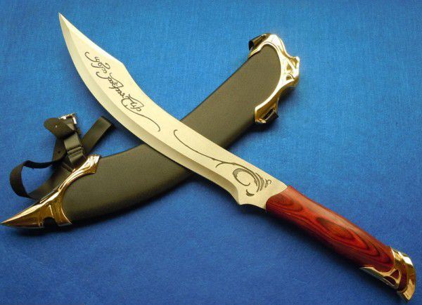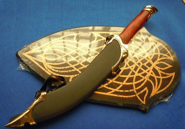 魔戒BY031-A 全长:53cm 刃长:36cm 刃厚:0.4cm 刀刃:不锈钢 柄材料:木把合金镀K金护手 刀鞘:木覆盖PU+合金K金饰物 配木板,可以挂墙上 重量:2.4Kg