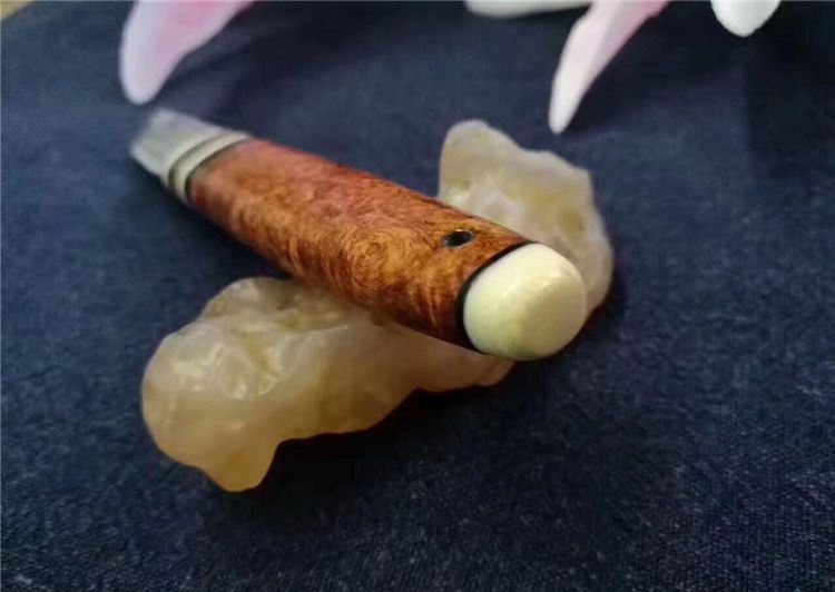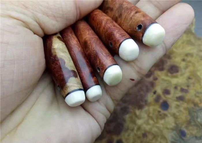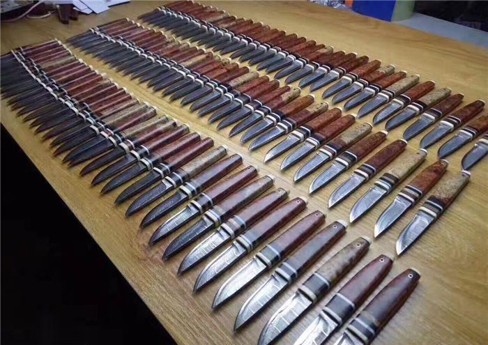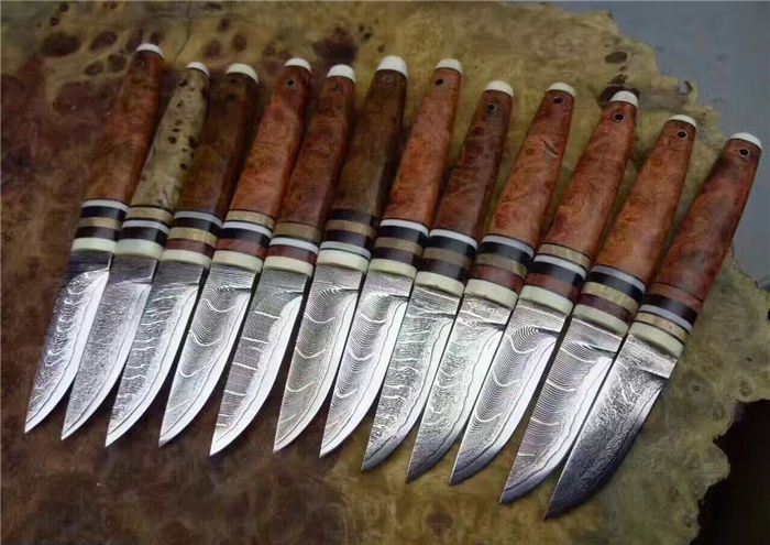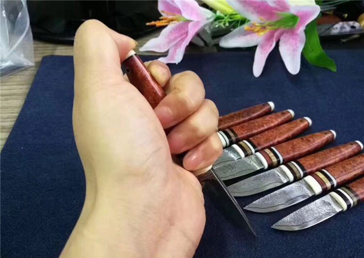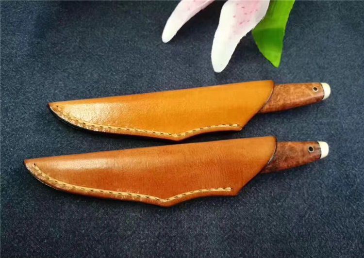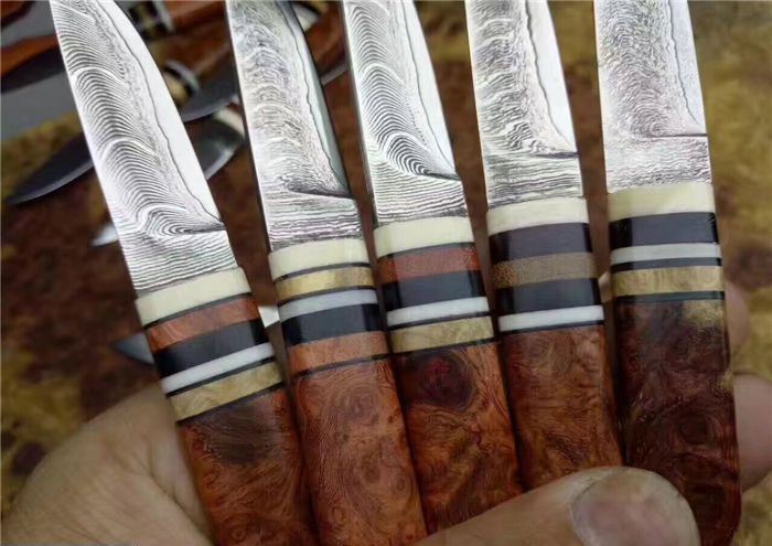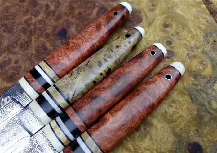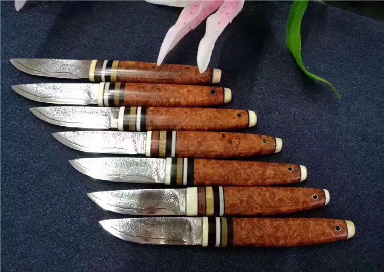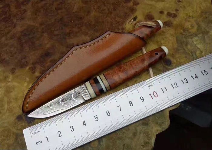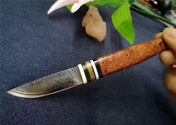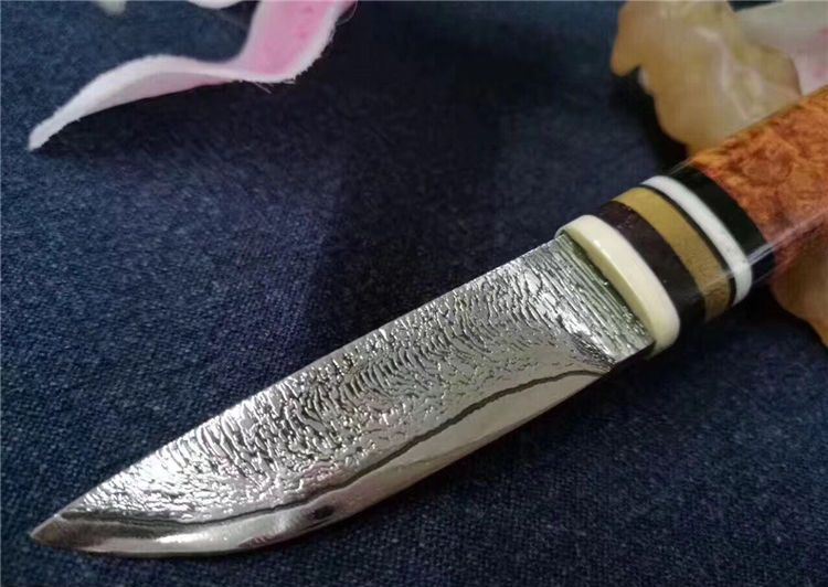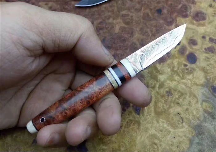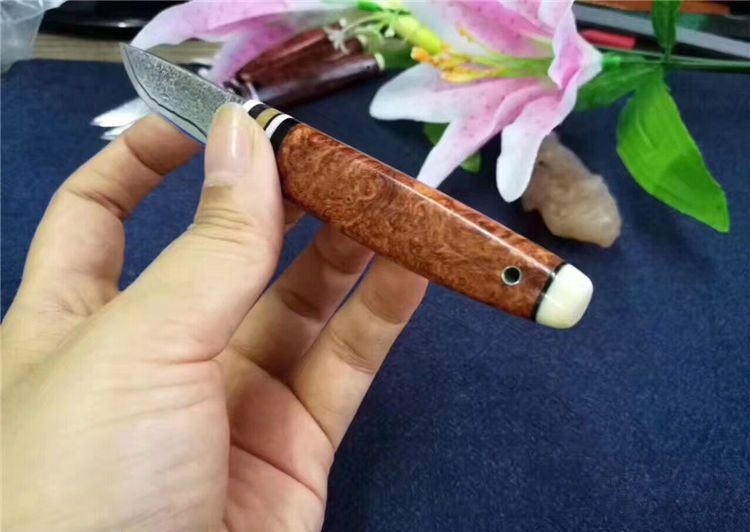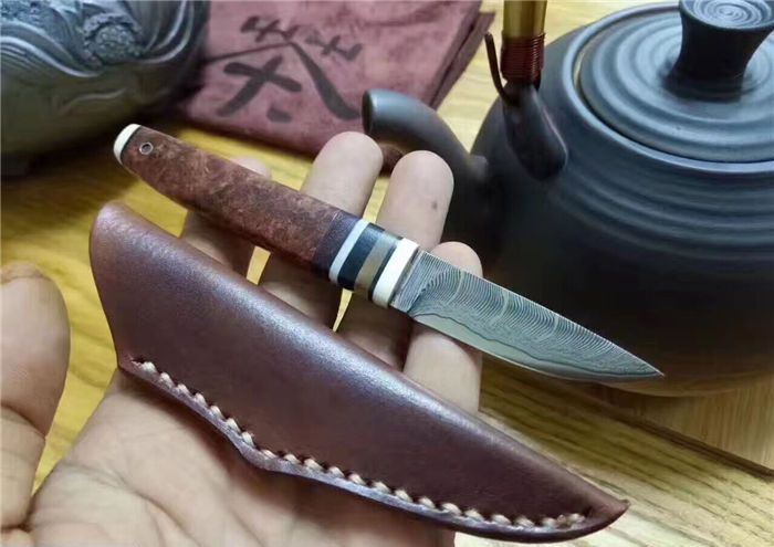 EDC迷你大马士革小刀 全长:130cm 刃长:52cm 刃厚:3.5mm 硬度:58~60HRC 刃材:大马士革钢(俄罗斯进口) 柄材:猛犸牙+花梨瘿木+骆驼骨+黑檀。 头层牛皮手缝刀鞘。可做茶刀、香刀、随身刀。纯手工制作,美观、锋利、耐用
