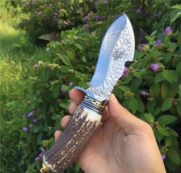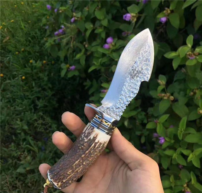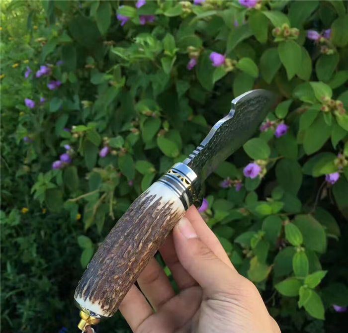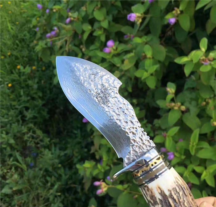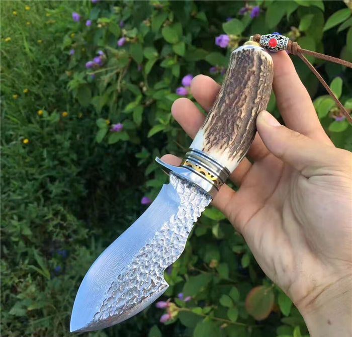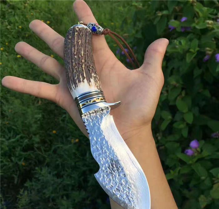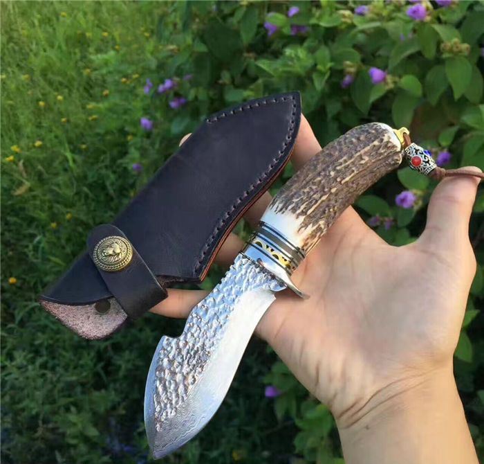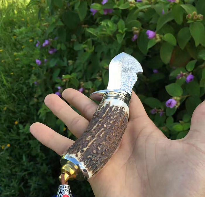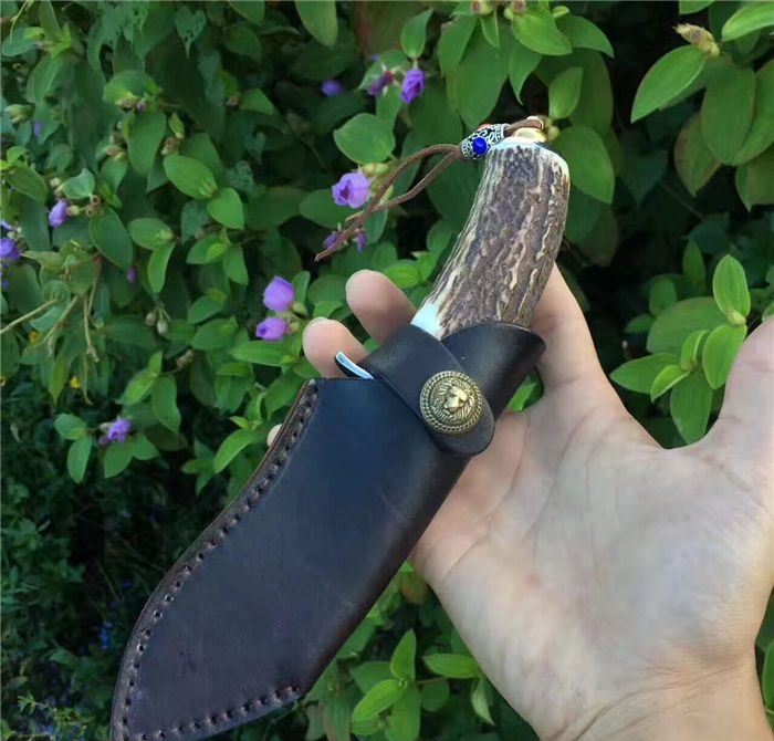 刀总长:23cm 刀长:10.5cm 柄长:12.5cm 钢材厚度:4.2mm 硬度:60HRC 刀刃钢材:大马士革钢(保留锻打凹凸粒感) 手柄用料:白钢护手+黄铜隔片+黑牛角隔片+天然鹿角柄、尾部附带彩珠吊坠 配雄狮标志手工牛皮刀套、黑色高档礼品盒包装