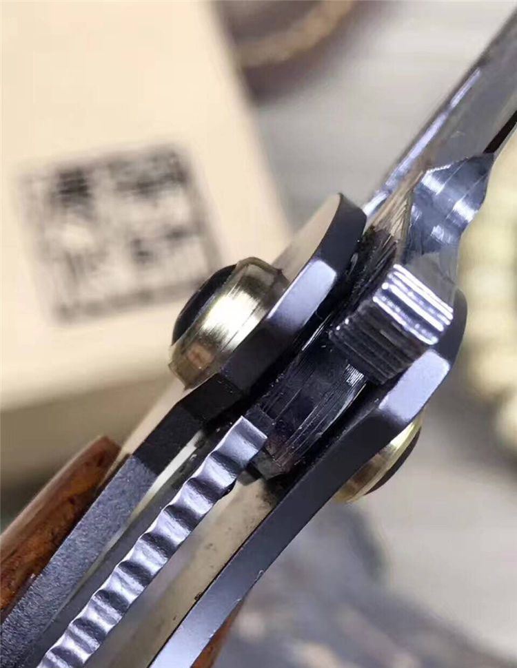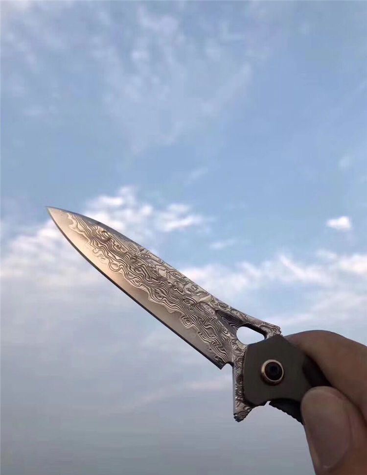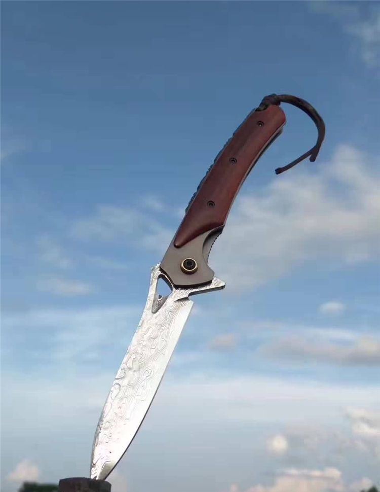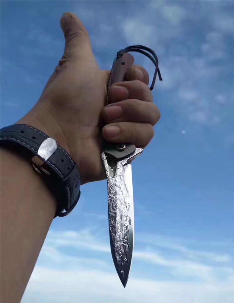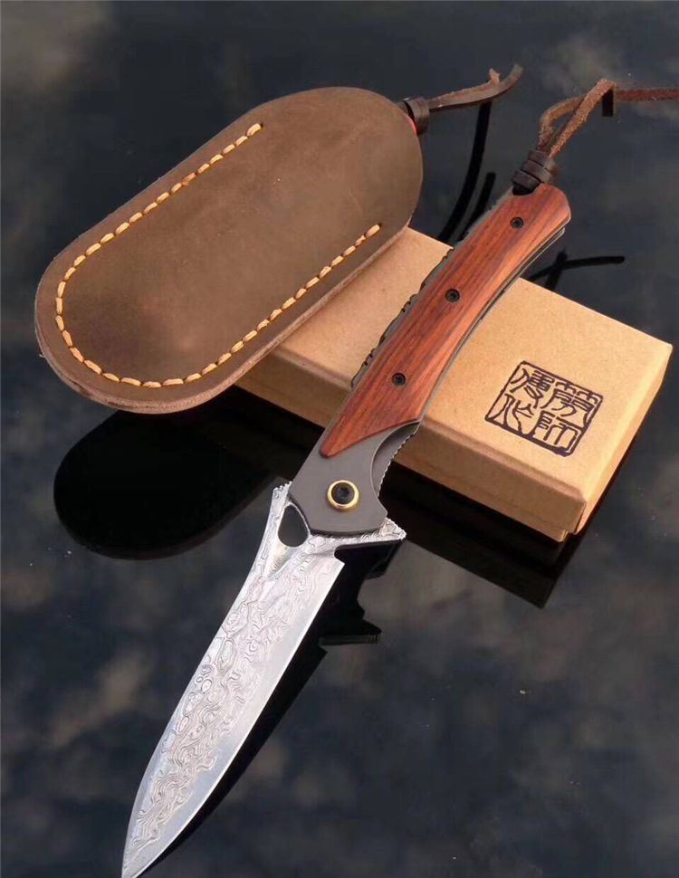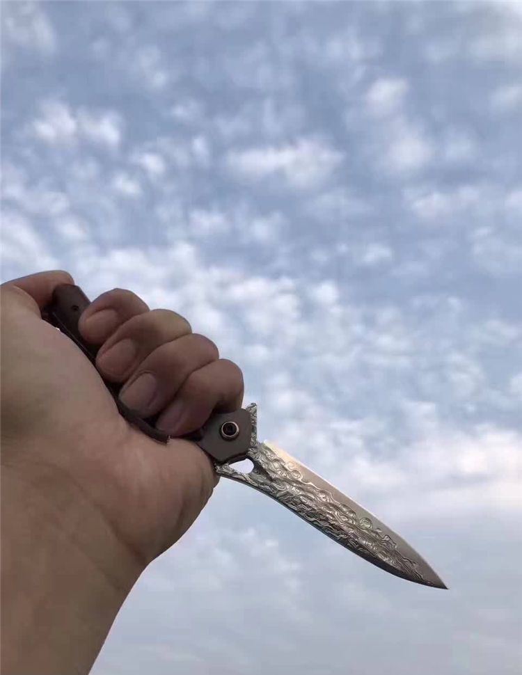 全长:20cm 刃长:9cm 刃厚:4mm 刃宽:1.8cm 柄长:11cm 此刀设计秉承纤细灵动之风格,整刀线条简约流畅,修长的刀刃犹如一柄利剑咄咄逼人,11cm长的刀柄更是握感舒适此把【剑鲨】的刀刃选用4.5mmVG10刃钢大马士革锻打祥云纹,精工抛镜光刃,祥云清晰流畅、随性自然、层次分明刀柄不锈钢骨架真空镀枪钛,背部手工挫花,镶嵌老料油腻黄檀木,轴部配置两片高精度滚珠轴承,一体鱼鳍快开设计。赠送头层牛皮手工缝制刀套