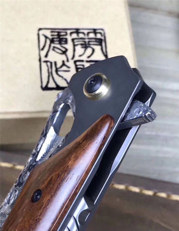 剑鲨简师傅大马士革折刀 全长:20cm 刃长:9cm 刃厚:4mm 刃宽:1.8cm 柄长:11cm 此刀设计秉承纤细灵动之风格,整刀线条简约流畅,修长的刀刃犹如一柄利剑咄咄逼人,11cm长的刀柄更是握感舒适此把【剑鲨】的刀刃选用4.5mmVG10刃钢大马士革锻打祥云纹,精工抛镜光刃,祥云清晰流畅、随性自然、层次分明刀柄不锈钢骨架真空镀枪钛,背部手工挫花,镶嵌老料油腻黄檀木,轴部配置两片高精度滚珠轴承,一体鱼鳍快开设计。赠送头层牛皮手工缝制刀套