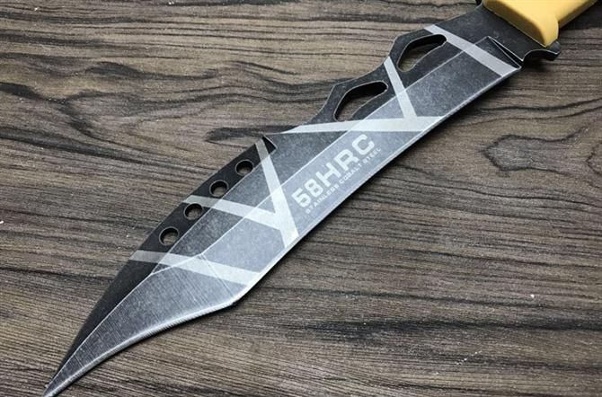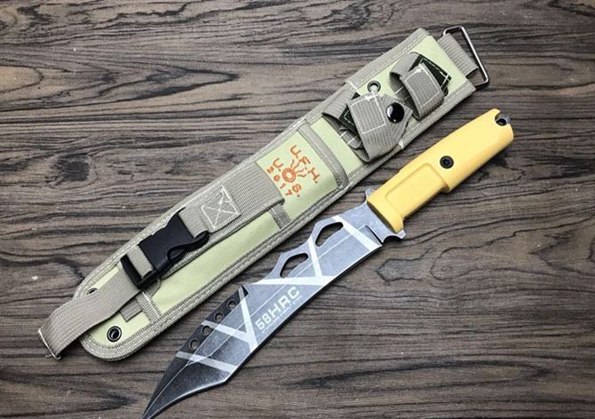 极端武力猎鹰直刀 全长:35.3cm 刃长:23cm 刃厚:0.5cm 柄长:12.3cm 刃材:5Cr13M0V 表面:沧桑石洗 硬度:58HRC 柄材:橡塑 鞘材:尼龙套 总重:600克(含包装)