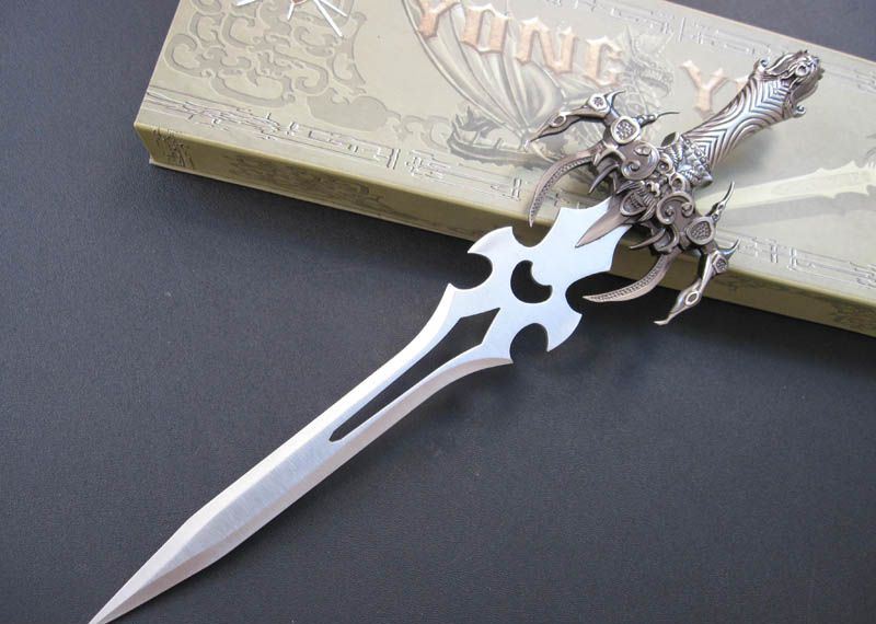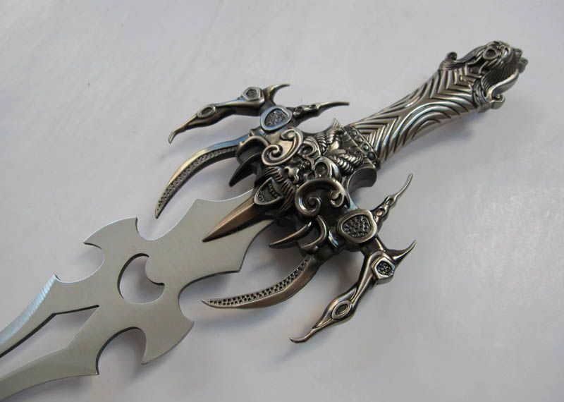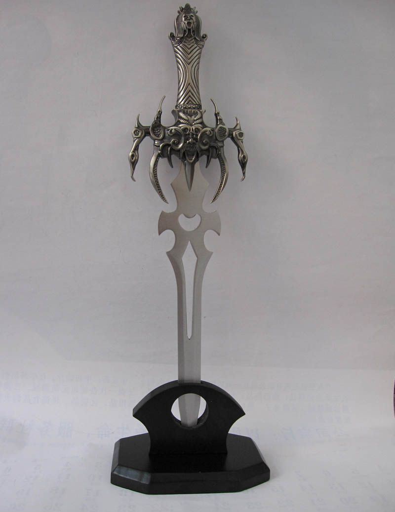 规格:剑长39厘米,剑厚:0.3厘米,剑身净重:440克, 整套重量:880克(含纸盒,木座) 材质:高级不锈钢 剑身:雕刻古典花纹 剑柄:欧式仿古 配立式剑座 此剑用精钢制造,剑形古典庄重, 质量上乘, 未开锋,纯粹为工艺收藏品。 置于家中气度非凡,是装点家居、馈送亲朋好友的最佳礼品,而且此剑有辟邪镇宅之用。