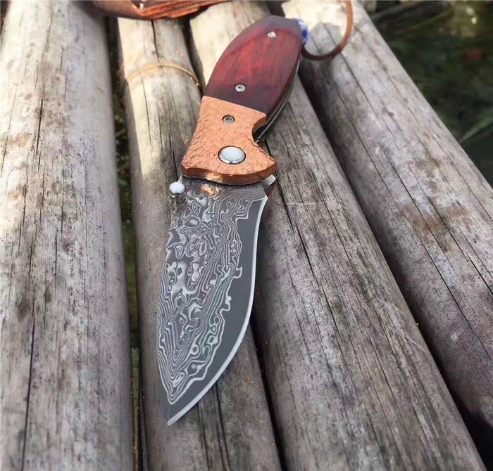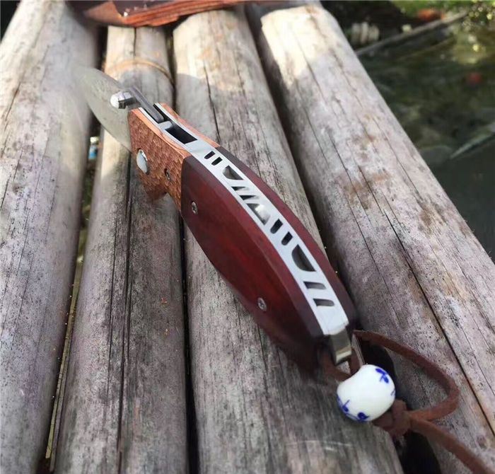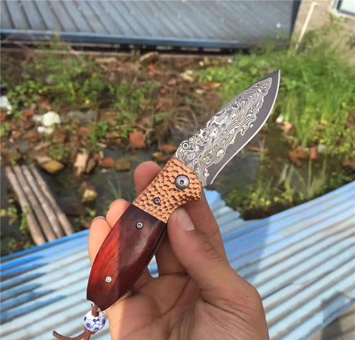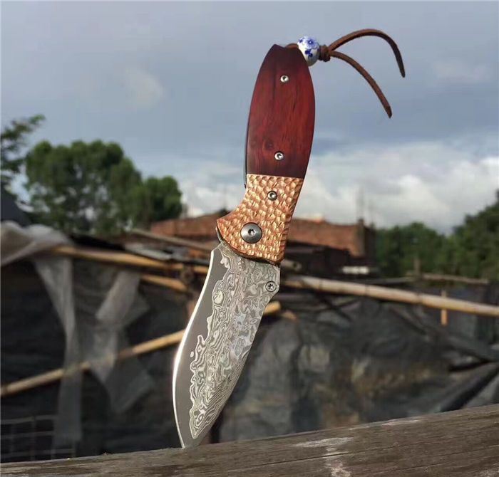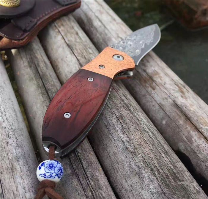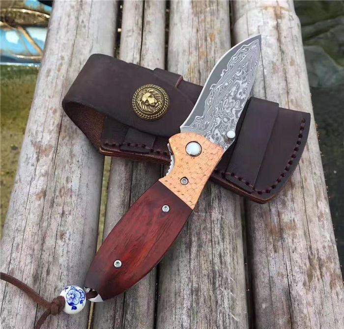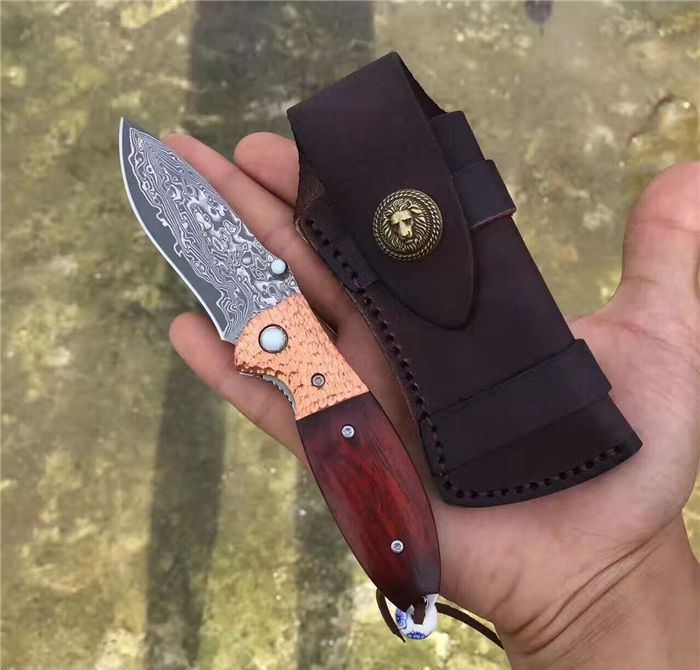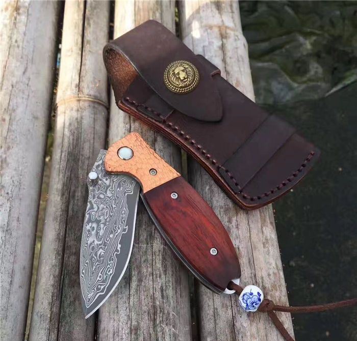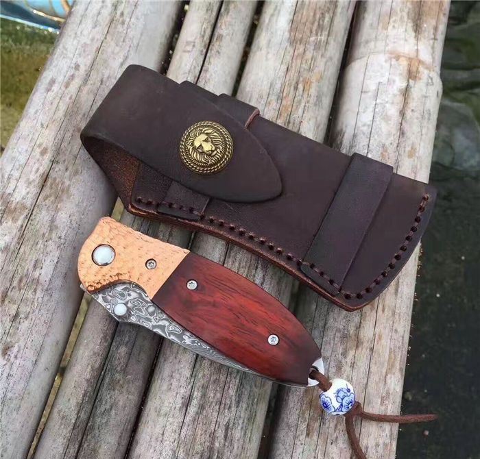 㛆鹰大马士革折刀 全长:17cm 刀刃:8cm 闭合长:9.5cm 钢材:大马士革钢 硬度:59-60HRC 钢材厚度:2.9mm 手柄做工材料:紫铜凹凸钢头+天然微粒黄檀木+彩色珠子 刀刃非常锋利、尾部佩彩珠+皮套+精美包装盒 意大利手工雄狮皮套