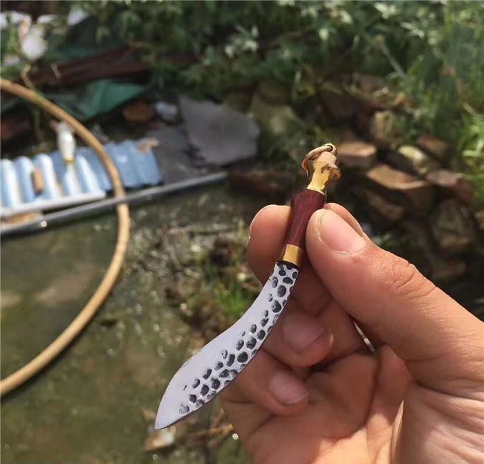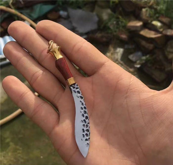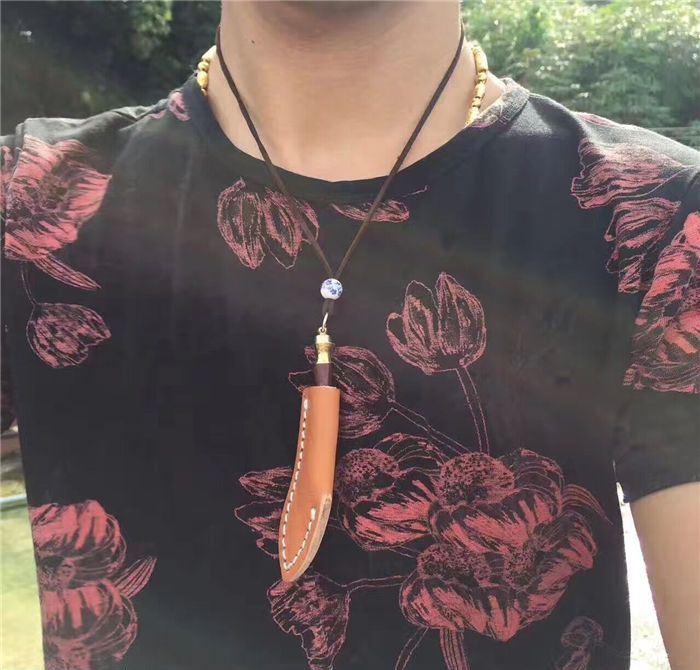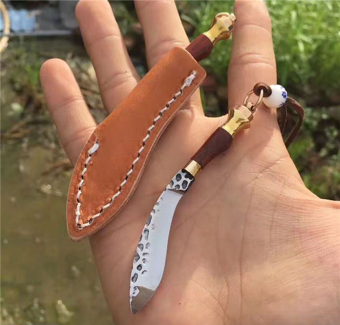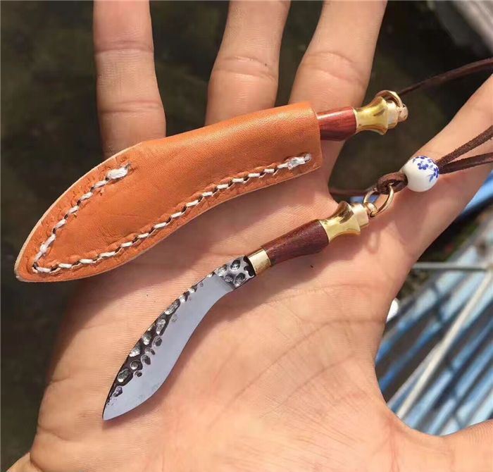迷你小天狗汽车弹簧钢 全长:9.5cm 刃长:5.5cm 手柄长:4cm 刀刃厚度:2.5mm 刃材料:汽车弹簧钢(保留锻打原纹)高硬度 手柄材料:纯黄铜+大叶紫檀木+钥匙圈 包装配置:手工皮刀套+皮绳+珠子