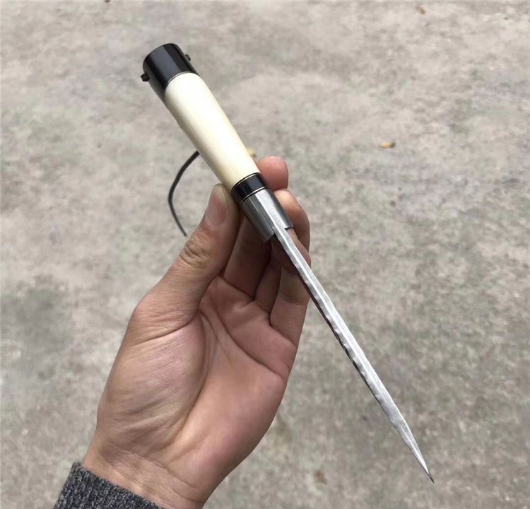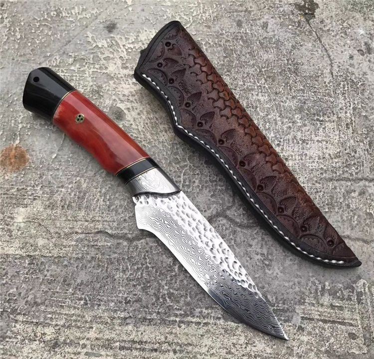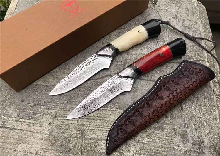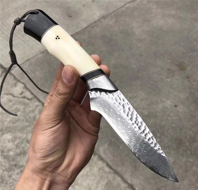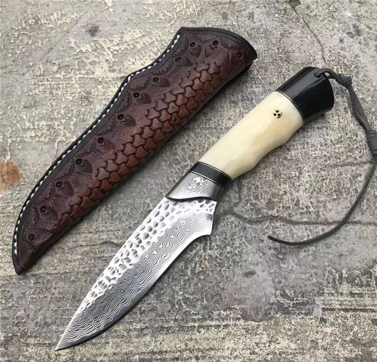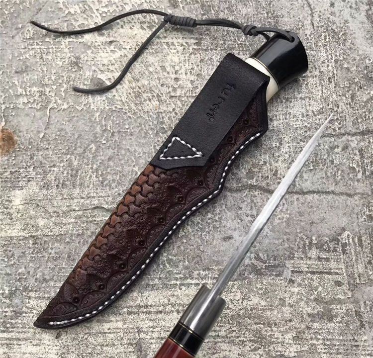 TUREN箭鱼大马士革直刀 总长:22.5cm 刃刃:10cm 刃厚:4.5cm 刃宽:2.8cm 钢材:日本夹层大马士革钢(钢芯层VG10)真空深冷热处理 硬度:60-61HRC 柄材:天然野生牦牛骨+牦牛角,大马士革钢头档手 皮套:意大利进口高档植鞣雕花皮,纯手工缝线雕花 包装:复古手工盒子包装