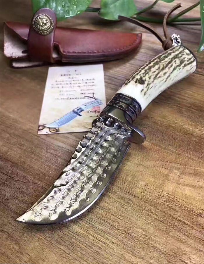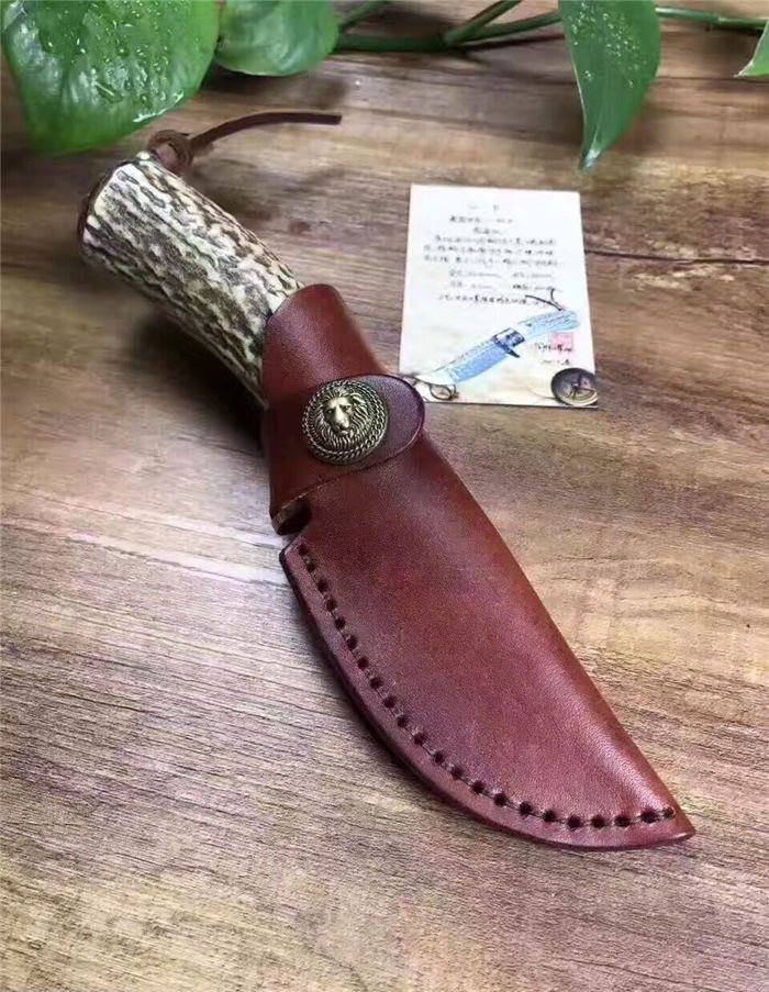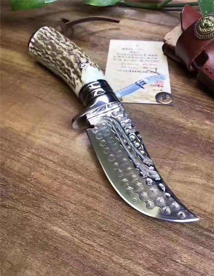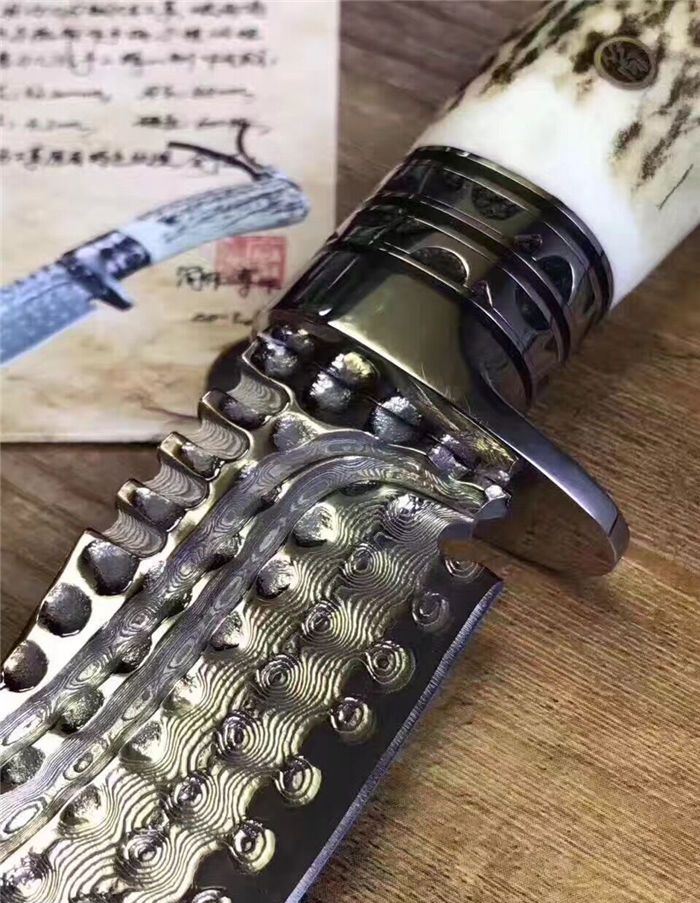 典藏世家秋水雨滴纹大马士革手工猎刀 全长:20cm 刃长:8.8cm 刃厚:4.3mm 硬度:60HRC 《典藏世家》为简师傅开山之作,此款【秋水】延续了其经典的设计风格,刃型流畅富有侵略性!刀刃采用进口VG10刃钢大马士革锻打雨滴纹,花纹形象自然 ,点点雨滴随风飘落,由两条蜿蜒的河流(长江、黄河)汇入大海......刀背雕刻长城形象。刀柄由不锈钢护手镶嵌两片不锈钢锉花刀隔,搭配原生态马鹿角几经手工精心制作!皮套为头层牛皮手工缝制,随刀赠送简师傅亲笔证书,复古礼盒包装