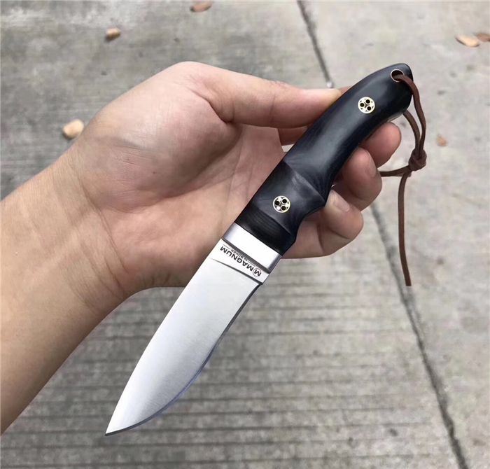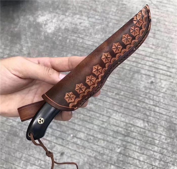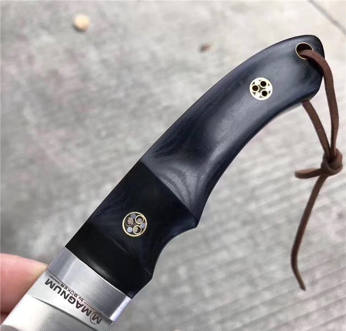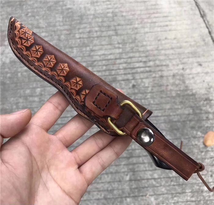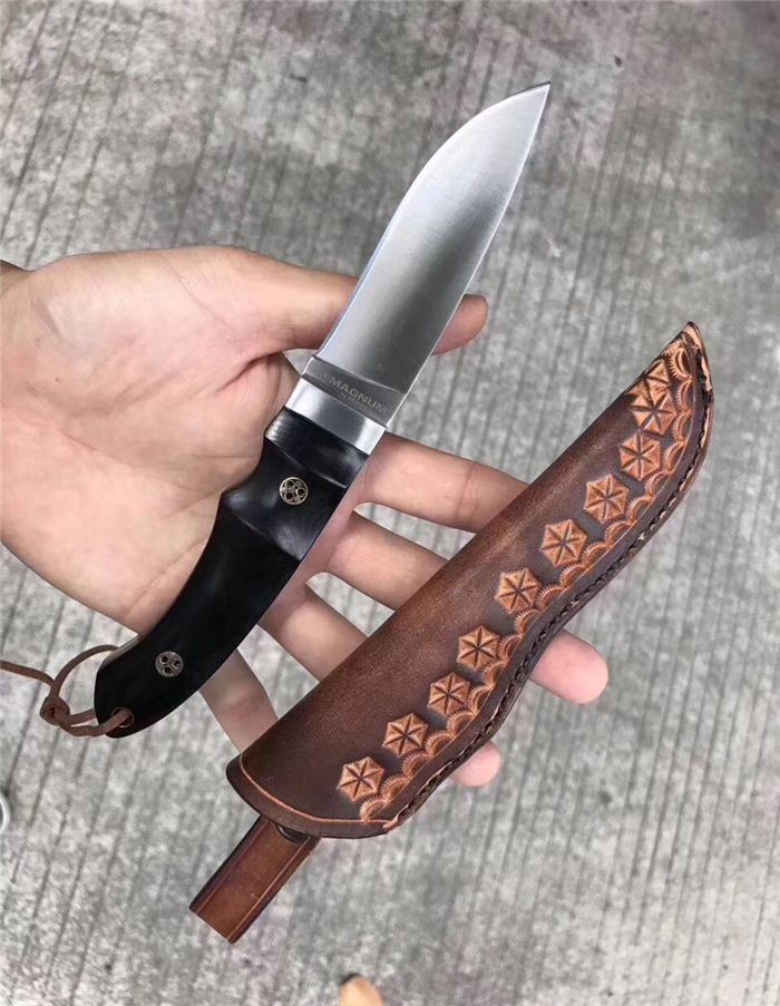 出口MAGNUM博克BOKER刀 总长:19.8cm 刃长:8.3cm 刃厚:3MM 刃宽:2.5cm 钢材:真宗440A钢 硬度:58HRC,韧性好保持性与防锈性好!是广泛国外用刀钢材!真空热处理! 柄材:进口米卡塔材质,配铜花钉固定! 皮套:手工雕花皮套(植鞣皮)手工缝线