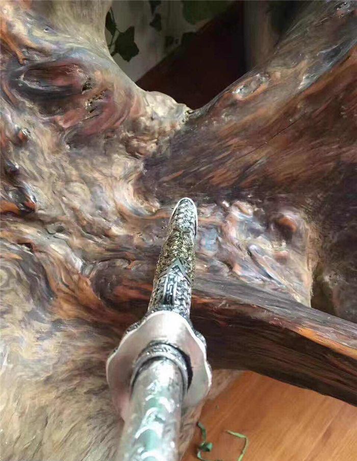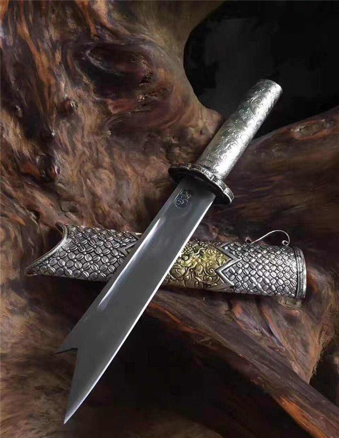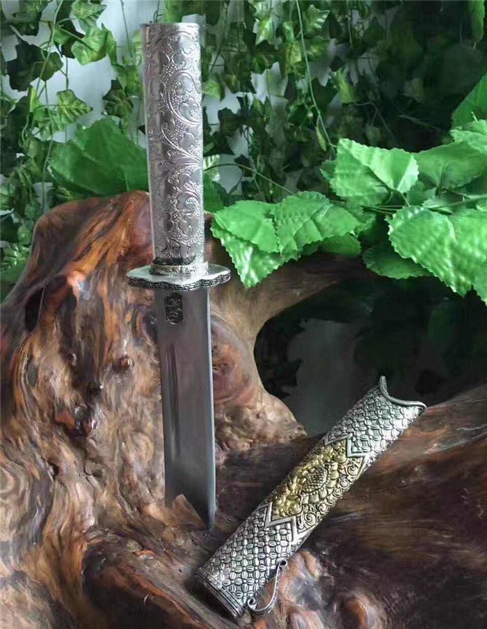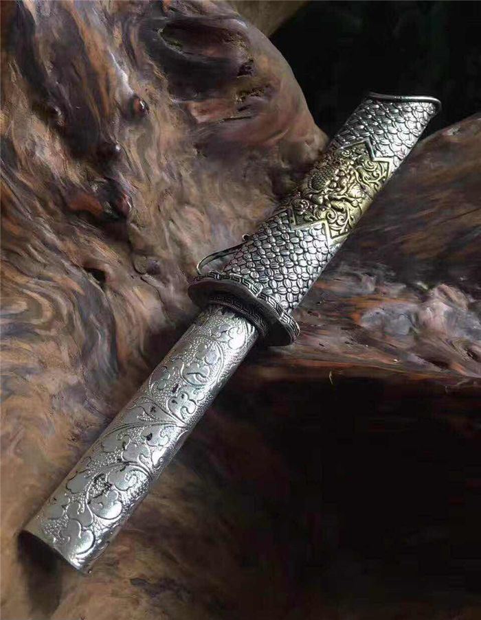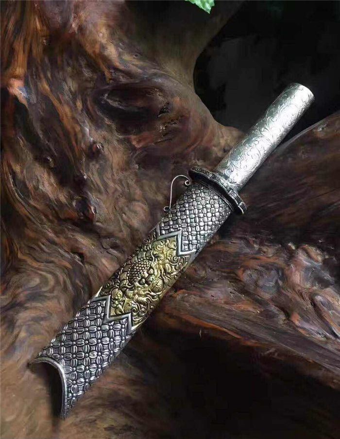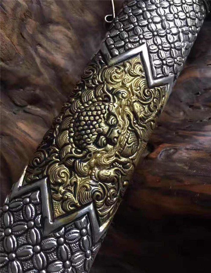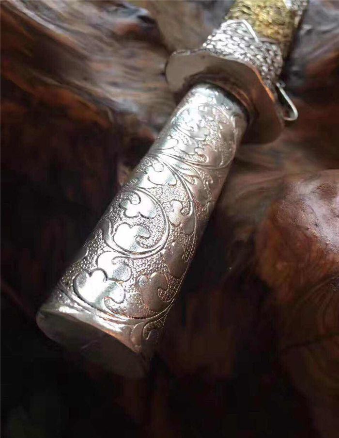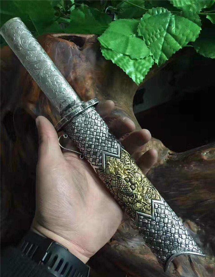 迷你版藏锦衣卫 全长:32厘米 柄长:12厘米 刃长:18厘米 刃宽:3.2厘米 全手工雕刻藏银鞘材,镀金镀银永不褪色,刃材采用弹簧钢锻打硬度高达60左右砍铁不伤刃