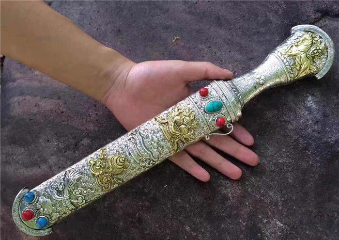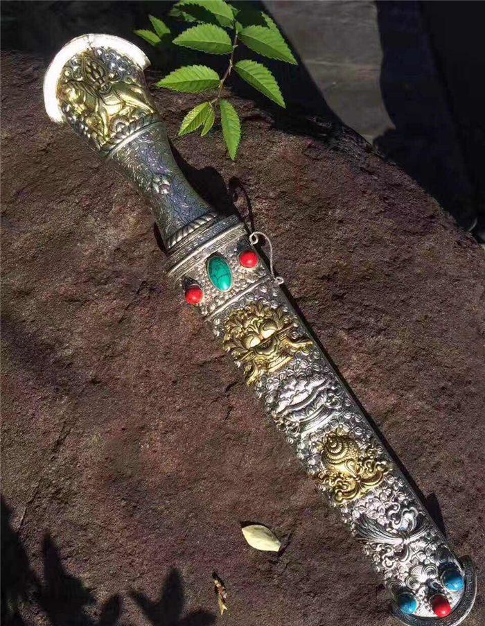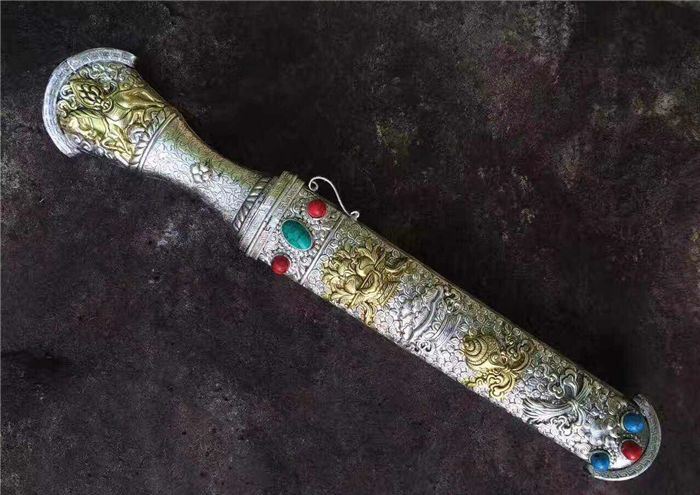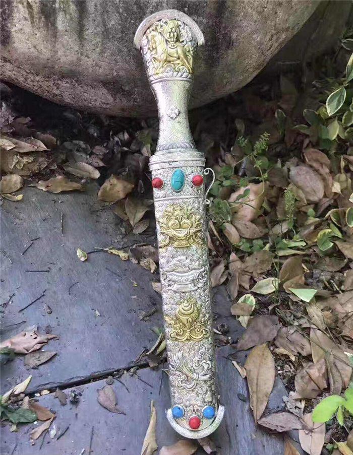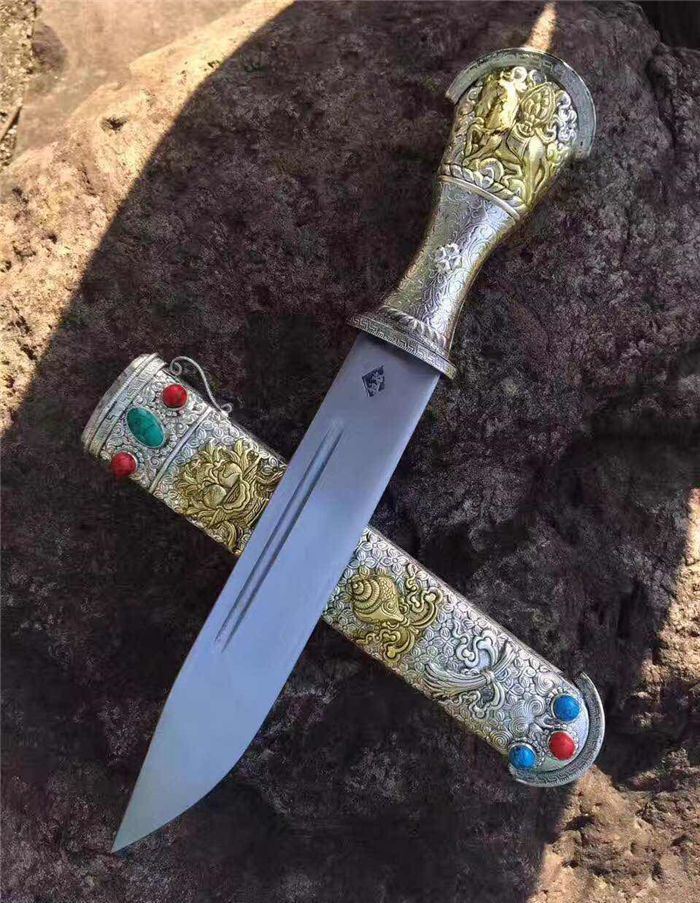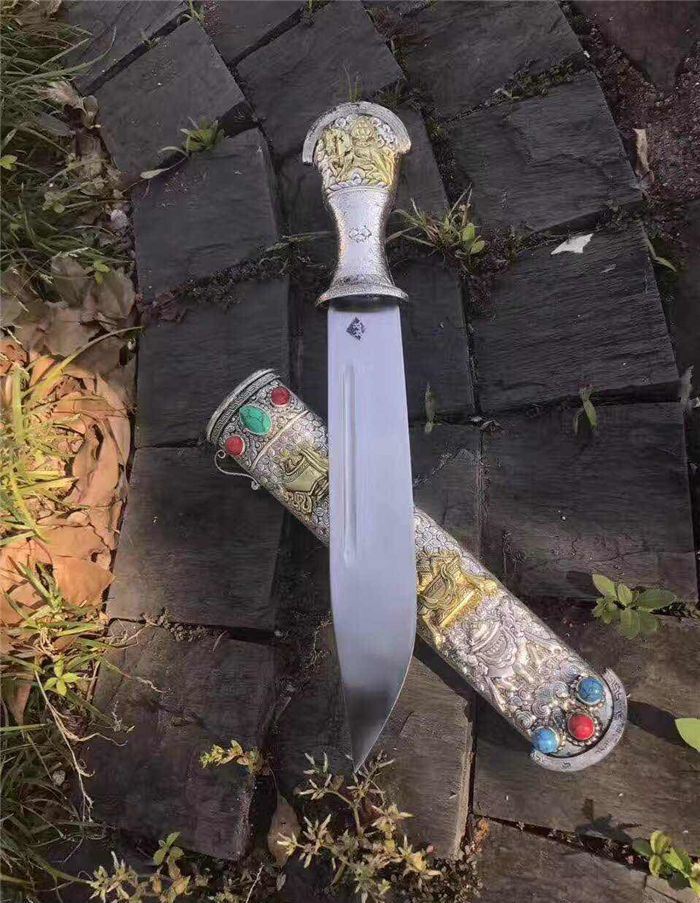 全手工雕刻白铜鞘材镶嵌红绿宝石,刃材采用弹簧钢锻打硬度60左右可以砍铁不伤刃