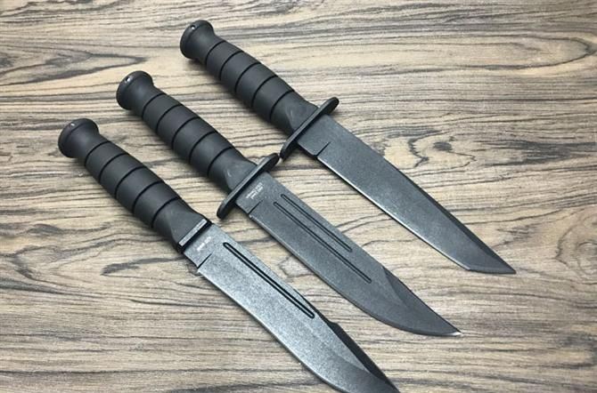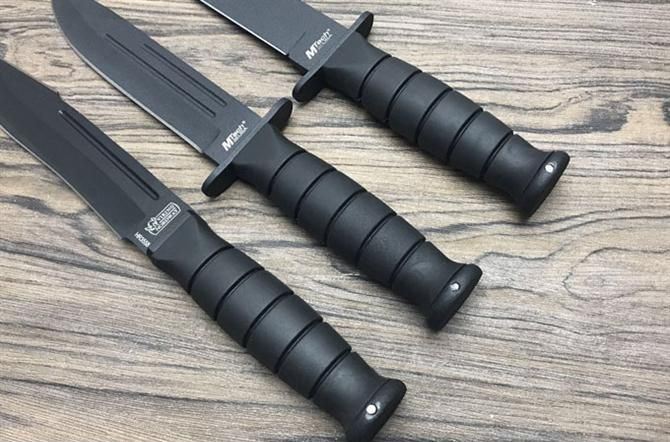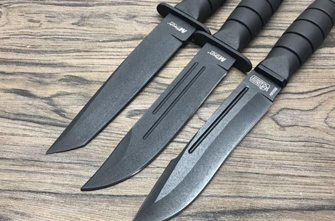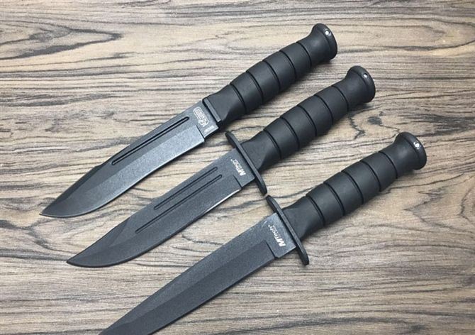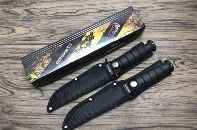 MT战斗刀 全长:26.3cm 刃长:15cm 柄长:11.3cm 刃厚:4.2mm 刃宽:3cm 刃材:420J2 柄材:橡塑 硬度:56Hrc 净重:216g 毛重:271g 表面:喷粗砂 刀套:尼龙套