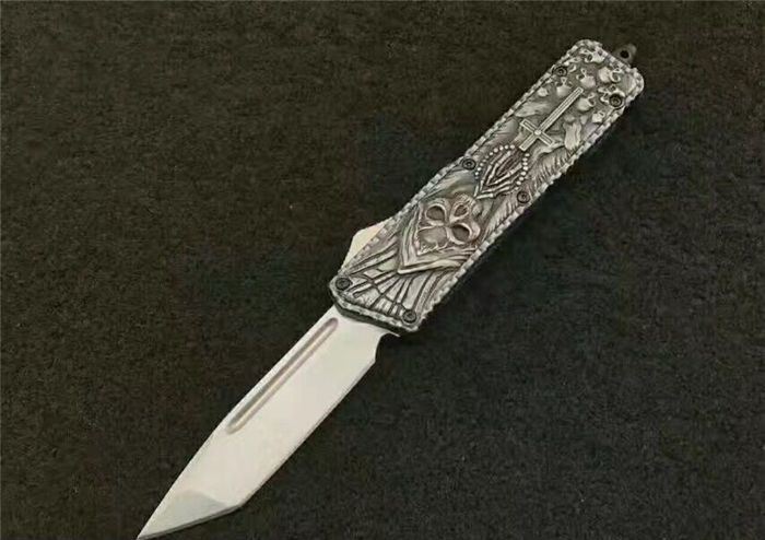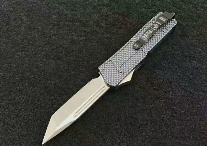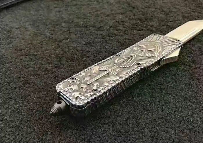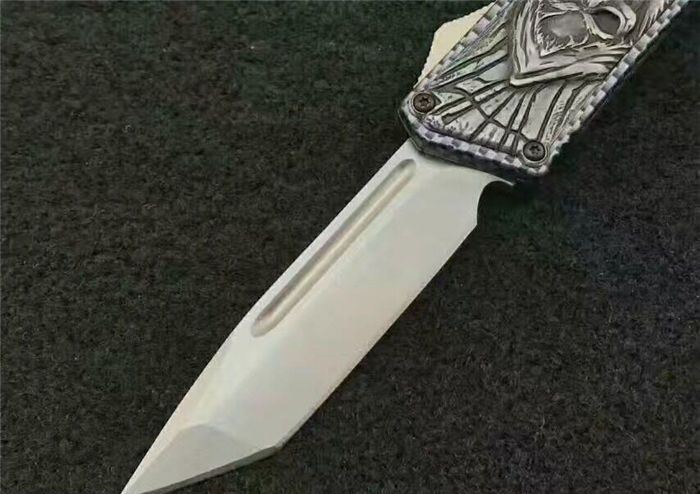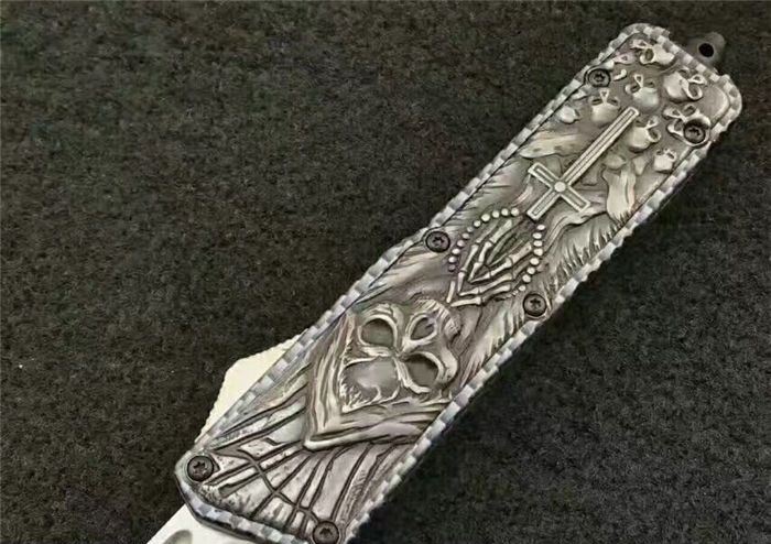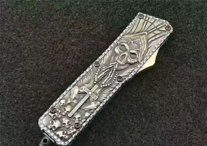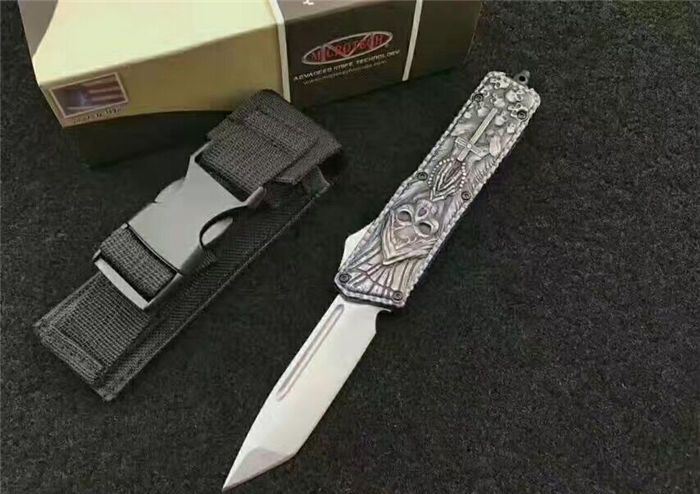 微技术MICROTECH死神直跳刀 全 长:21.3cm (含尾锥长度) 刃 长:8.5cm 刃 厚:2.6mm 刃 材:440 硬 度:57HRC 重 量:301.0克(含包装物) 表 面:黑白拉丝(刀刃) 柄 材:扎花凸图案锌铝合金 刀 鞘:尼龙 锁 闭:弹簧直出 备 注:带背夹
