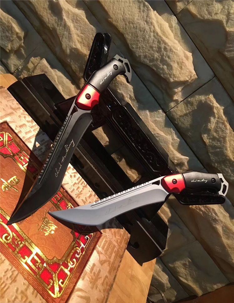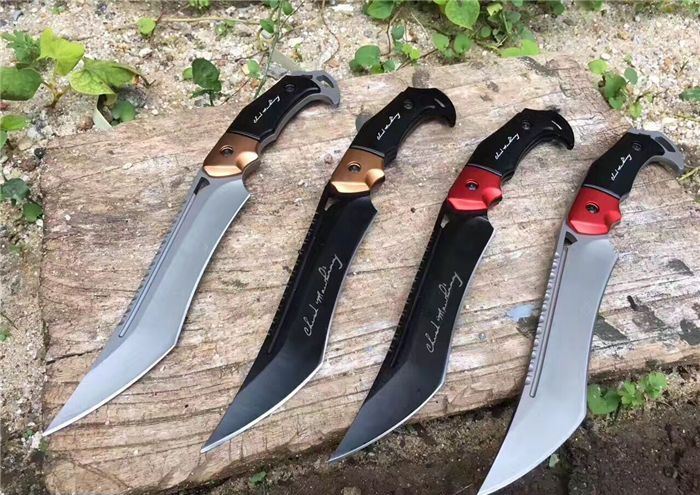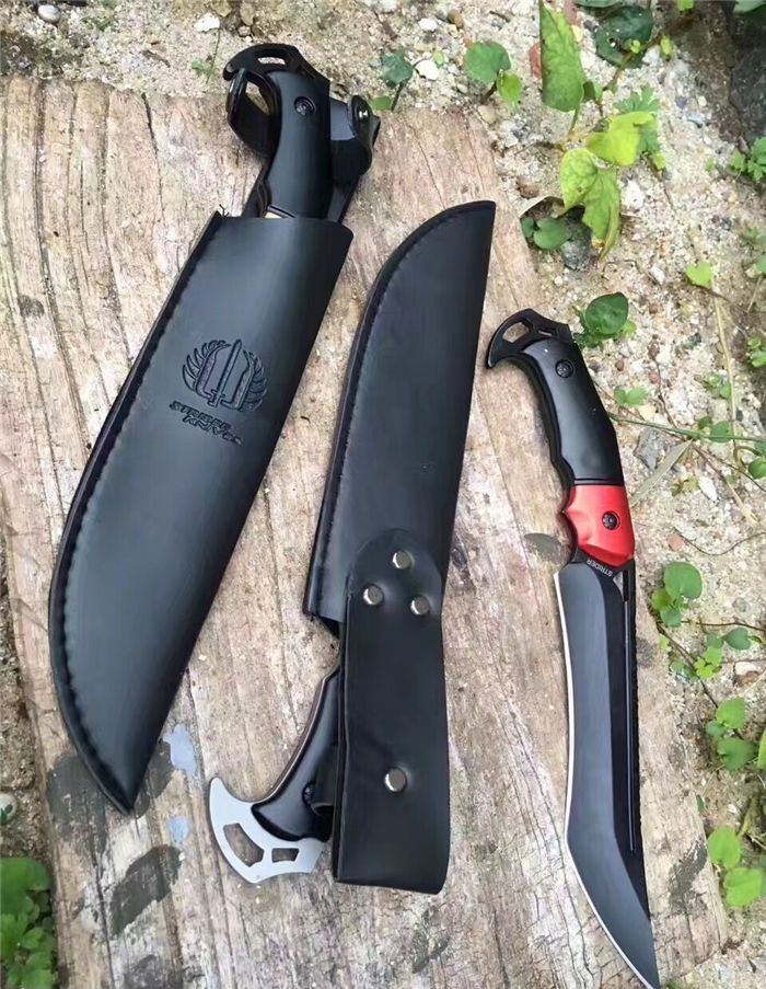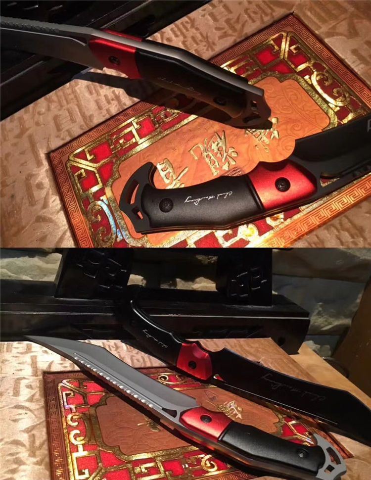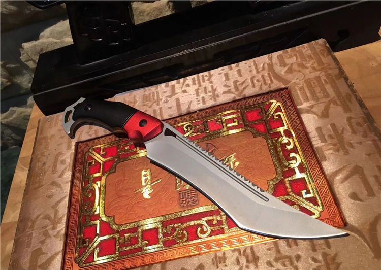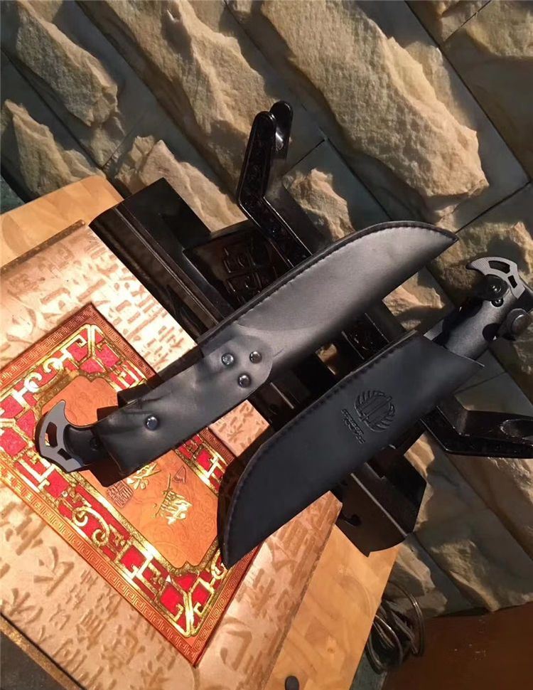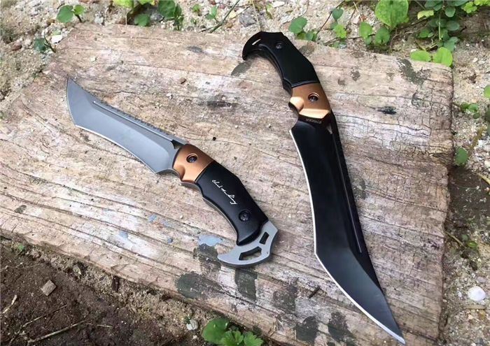 挺进者月形弯刀 全长:30cm 刃长:17.5cm 刃宽:4cm (最宽处) 刃厚:0.56cm 刃材:8Cr13 硬度:59HRC 表面:渡钛 柄材:航空铝柄 柄长:12cm 刀重:340克 总重:650克(含包装物) 其他:刀身贯穿至刀柄末端,用铜钉固定 附件:刀套