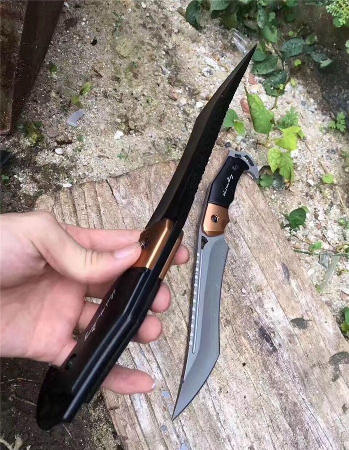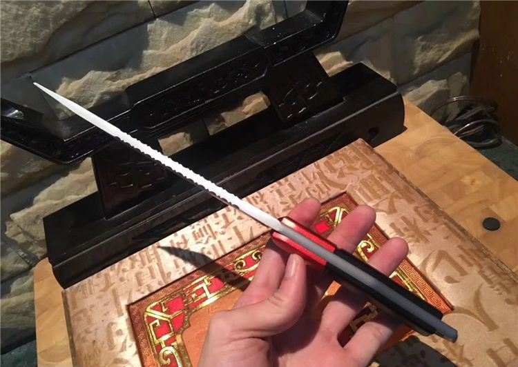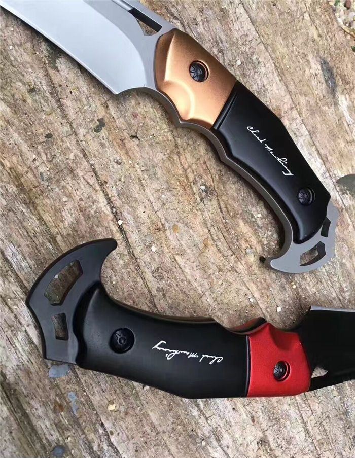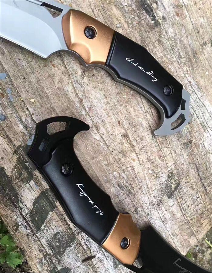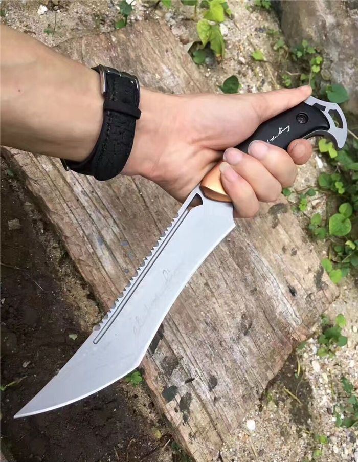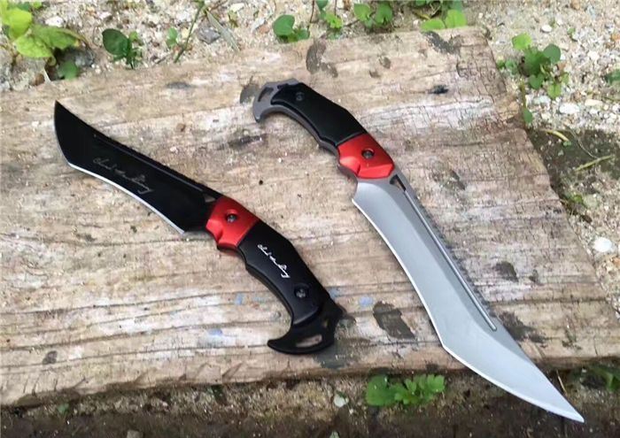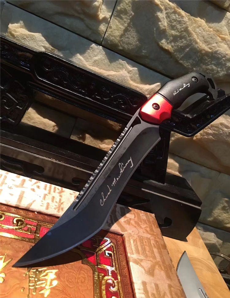挺进者月形弯刀 全长:30cm 刃长:17.5cm 刃宽:4cm (最宽处) 刃厚:0.56cm 刃材:8Cr13 硬度:59HRC 表面:渡钛 柄材:航空铝柄 柄长:12cm 刀重:340克 总重:650克(含包装物) 其他:刀身贯穿至刀柄末端,用铜钉固定 附件:刀套
