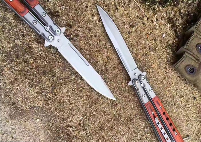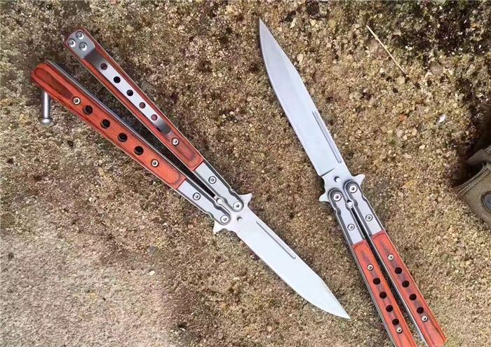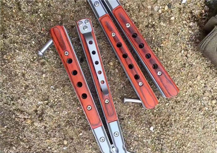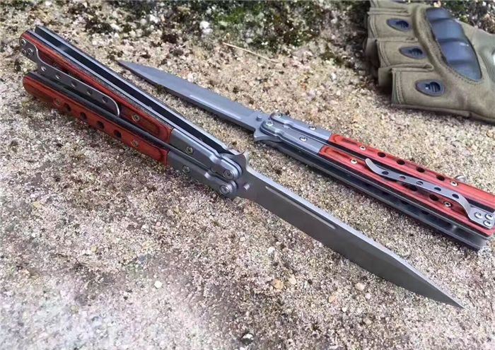 蝴蝶单刃木柄甩刀 全 长:240mm 刃 长:90mm 柄 长:140mm 刃 宽:18mm 刃 厚:2.8mm 刃 材:3Cr13Mov 重 量:130g(含包装) 硬 度:55HRC 表 面:砂光, 柄 材:木夹钢 其 他:和尼龙套