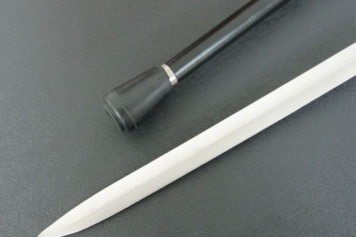 全 长:97.0cm 刃 长:30.0cm 柄 长: 12.0cm 刃 宽:1.5cm(最宽处) 刃 厚:2.7mm 刃 材:420 硬 度:52HRC 手 柄:锌铝合金 表 面:砂光 重 量: 900.0克 备 注: 剑藏于手杖中