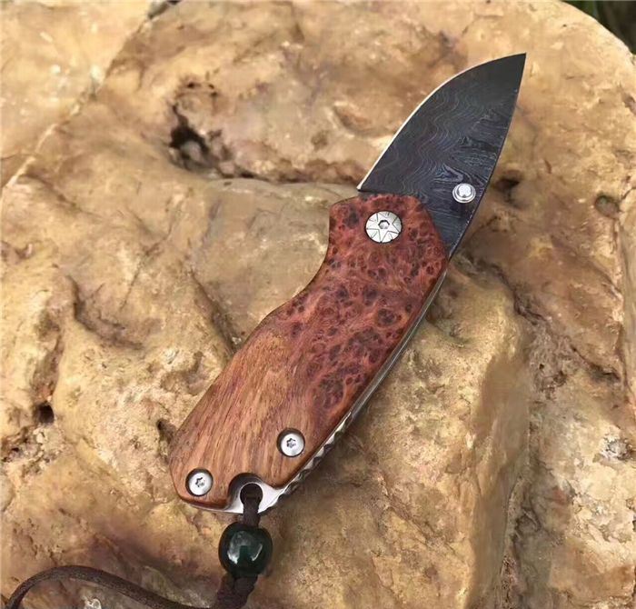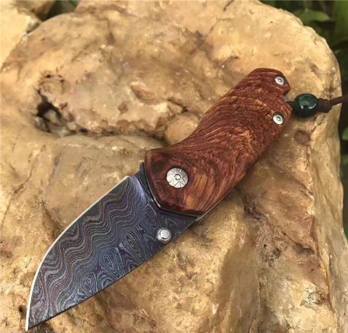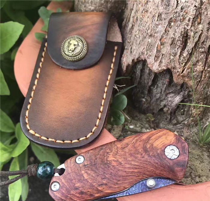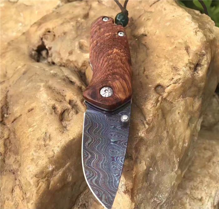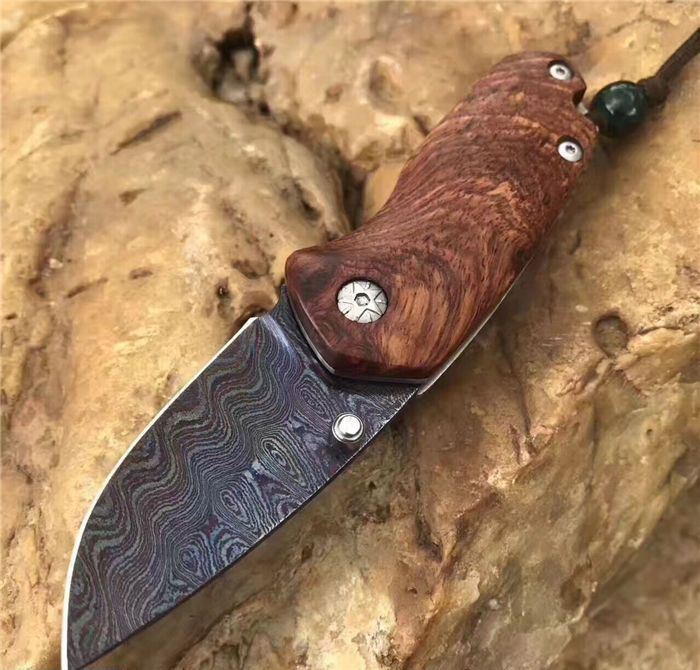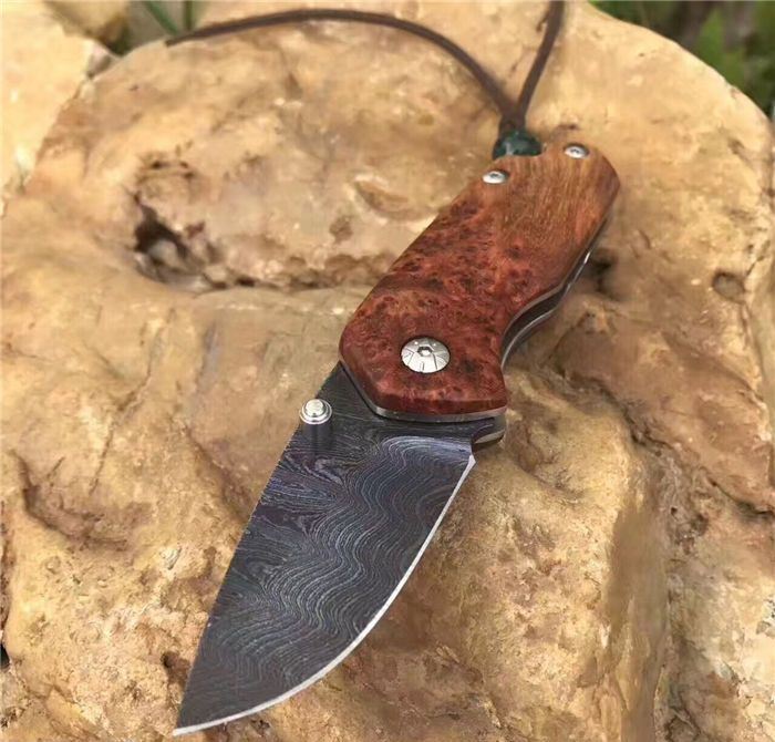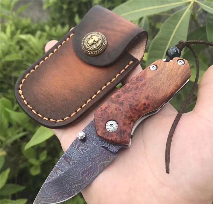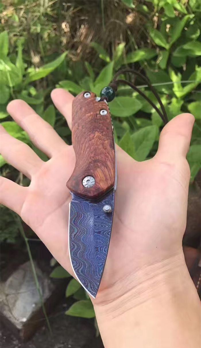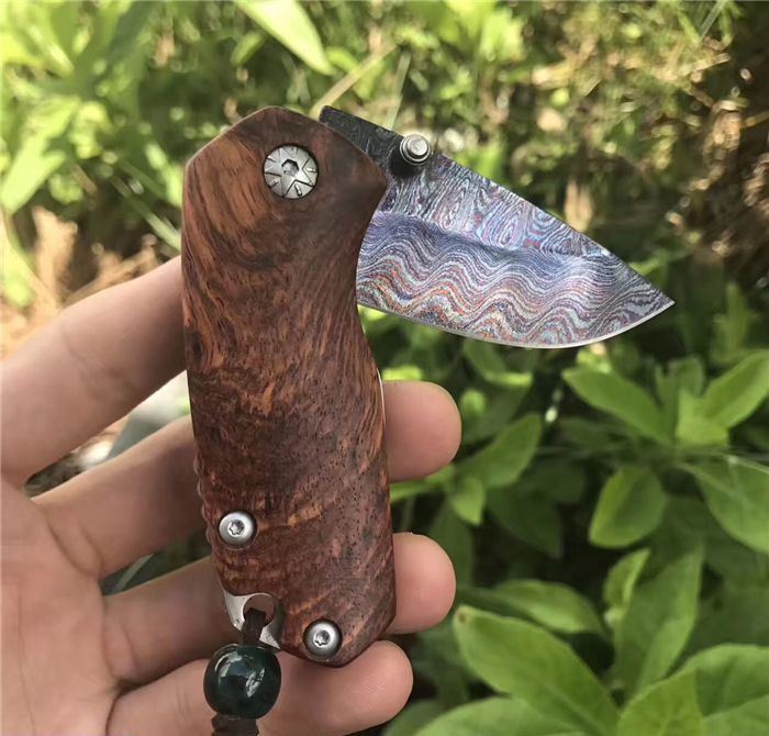 托马斯影帝大马士革折刀 全 长:13.3cm 刃 长:5.6cm 柄 长:7.7cm 刃 厚:3.0mm 刃 宽:2.8cm 刃 材:进口大马士革钢 硬 度:59-60HRC 重 量:约105克(含包装) 表 面:大马士革锻打托马斯纹彩色 柄 材:天然红影木+不锈钢