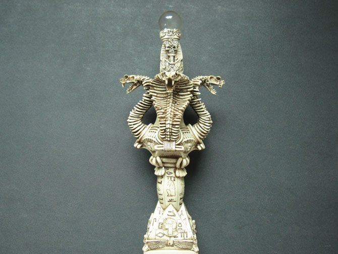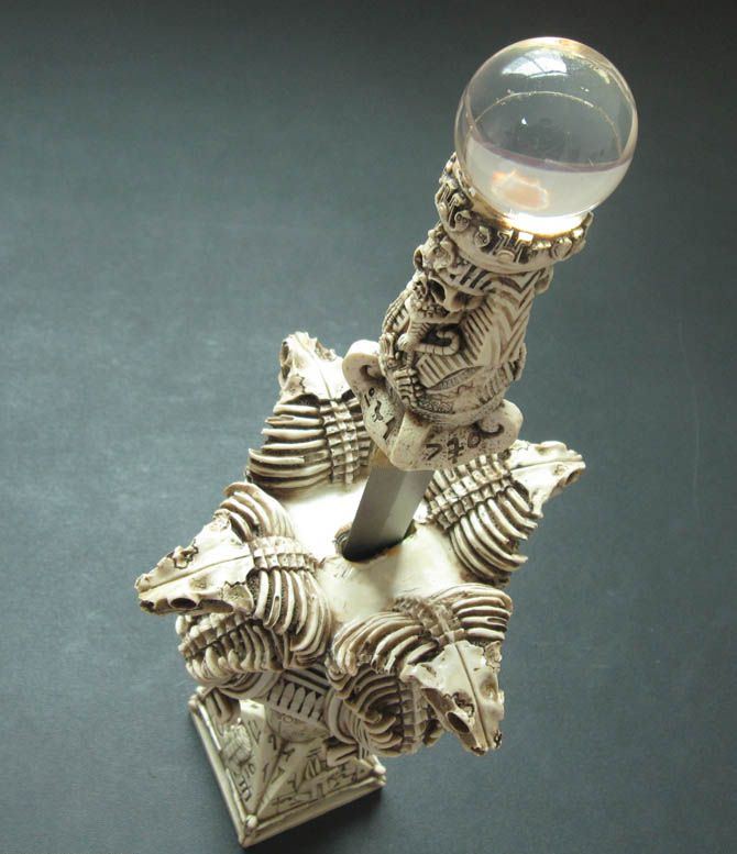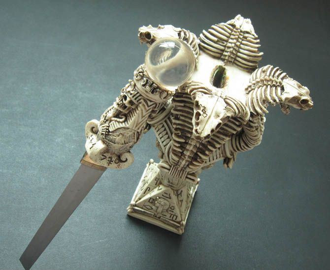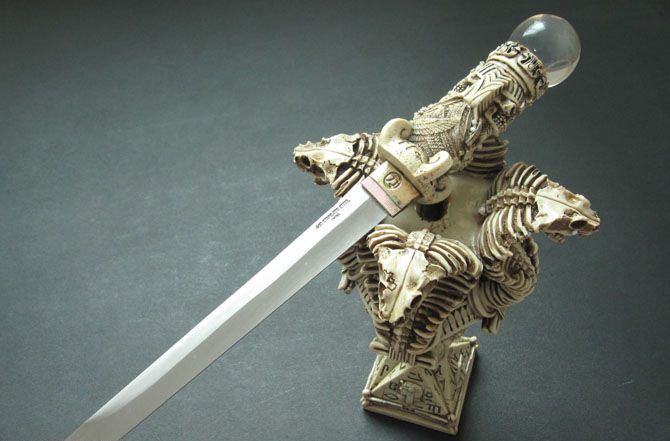 高 度:42.0cm 宽 度:19.0cm 刃 长:22.5cm 柄 长:14.0cm 刃 宽:2.5cm(最宽处) 刃 厚:3.3mm 刃 材:420 硬 度:57HRC 刀 柄:树脂材料,骷髅形 表 面:砂光 刀 座:树脂材料,金字塔以及眼镜蛇 重 量:2840.0克