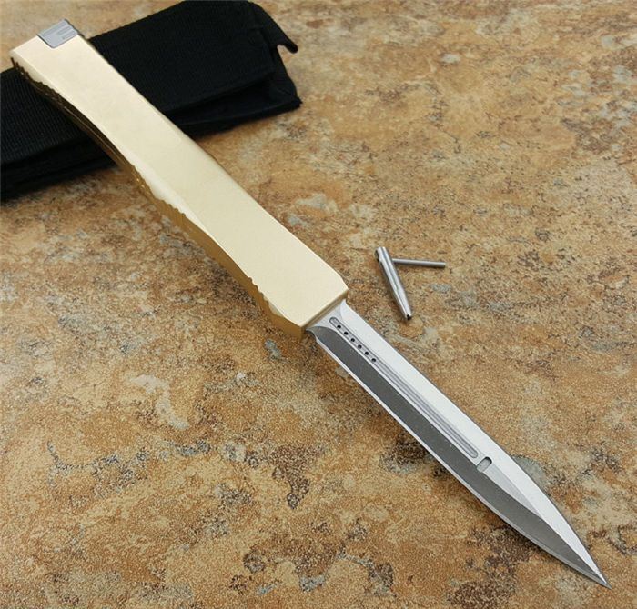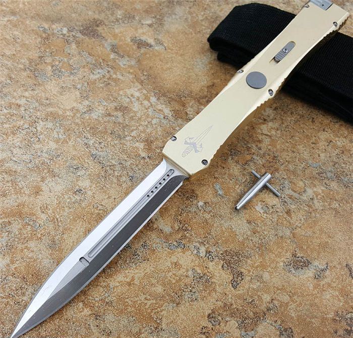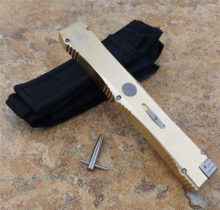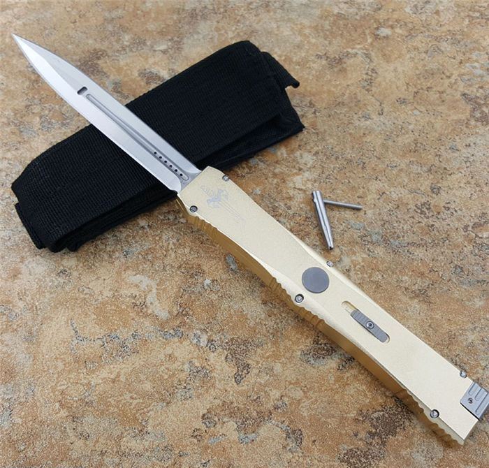 微技术Nemesis IV复仇女神IV大剑标土豪金双锋全刃 全 长: 261mm 刃 长: 110mm 闭合长度: 151mm 刃 材: D2 表 面: 缎光 硬 度: 59-60 HRC 刃 厚: 3mm 柄 材: 铝合金T6-6061,阳极氧化土豪金 机 制: 自动直线跳出,手动收回 重 量: 118g