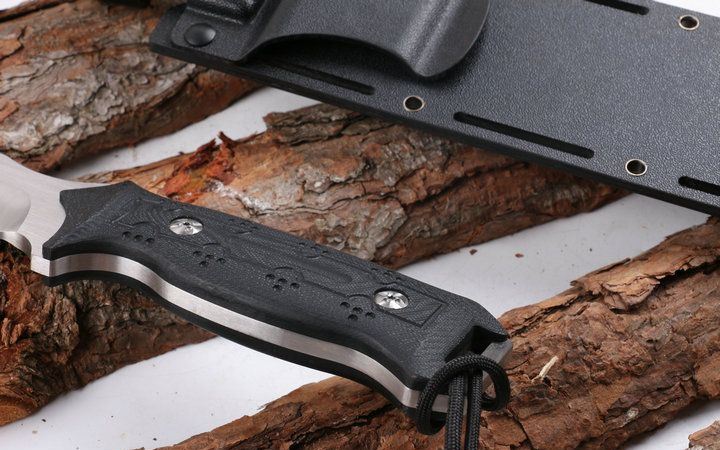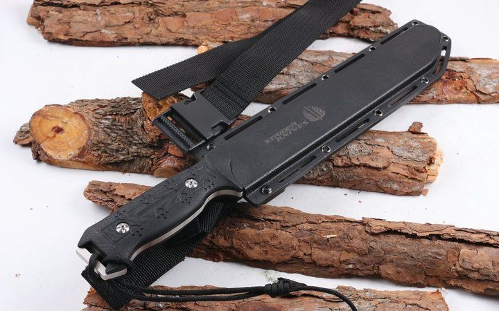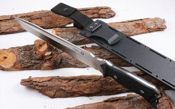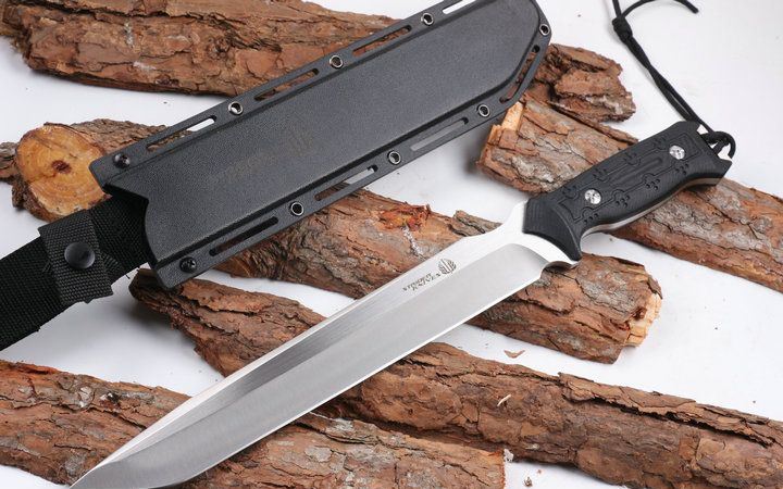 挺进者利剑直刀 全 长:43CM 刃 长:29CM 柄 长:14.5CM 身 最大宽度:4CM 刀 厚:0.58CM 刃 面:精细沙光 刀 重:672克 毛 重:940克(含k鞘) 钢 材:440C 硬 度:56-58CHR 刀 柄:电脑锣G10防滑手柄 刀 套:玻纤套 其 它:原黄盒装,配绑腿绳