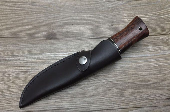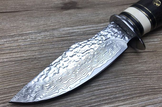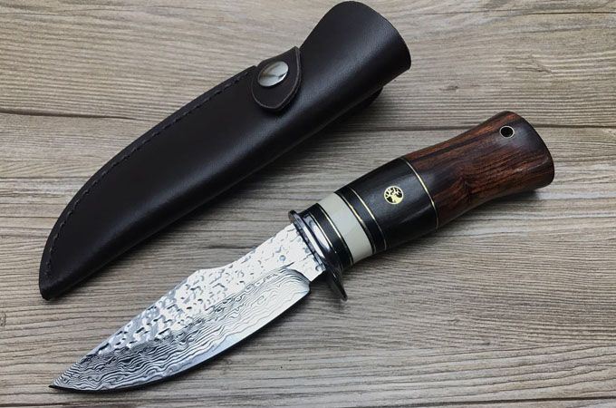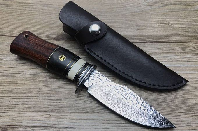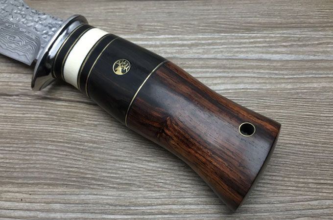 大马士革小型博弈直刀 全 长:22.8cm 刃 长:10.5cm 刃 宽:3cm 刃 厚:4mm 柄 长:10cm 刃 材:进口大马士革钢 硬 度:58-60HRC 净 重:250g 总 重:300克(含皮套) 表 面:大马士革花纹 柄 材:黄檀木+钢头+象牙 其 他:牛皮刀套