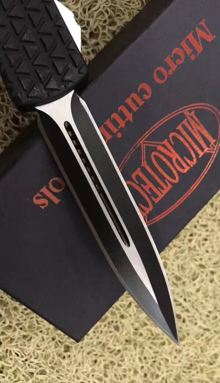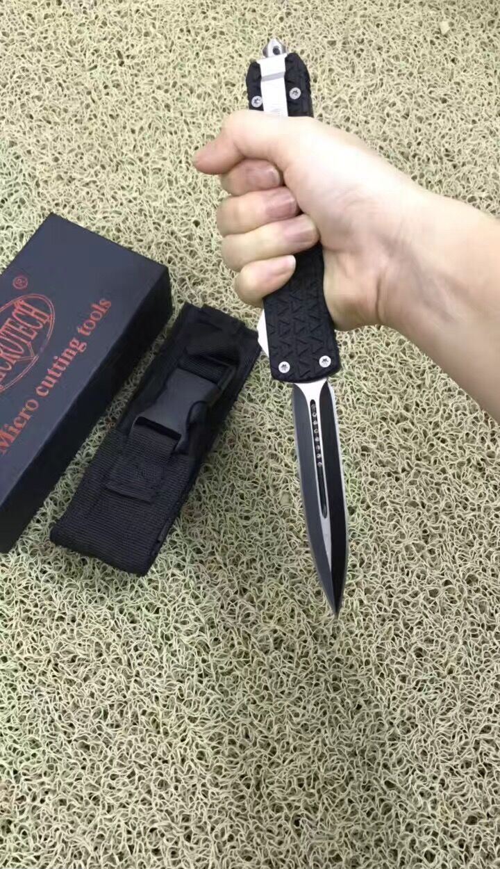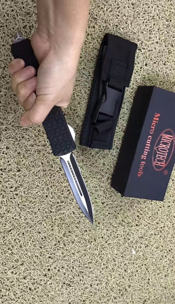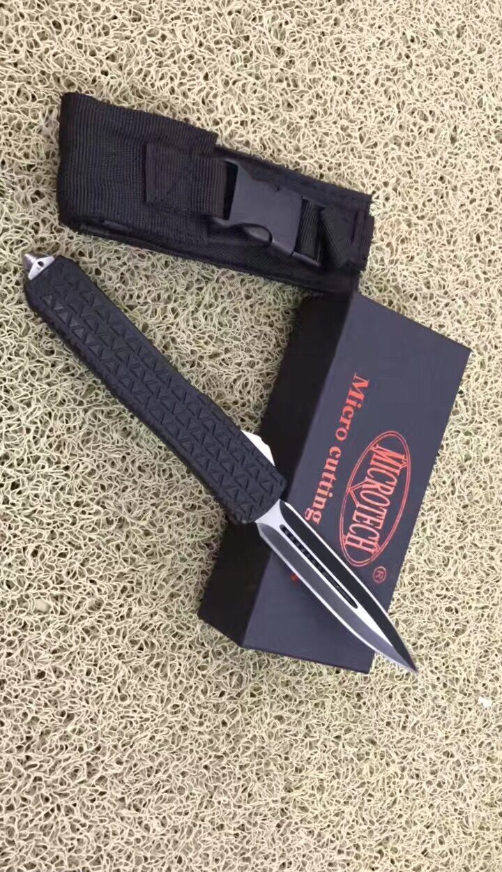 新款微技术伤齿龙C9双锋直跳刀 全 长:23.0cm (含尾锥长度) 刃 长:9.0cm 刃 厚:3mm 刃 材:440 硬 度:57HRC 刀净重:230.0克 总重量:350.0克(含包装物) 表 面:灰钛(刀刃) 柄 材:锌铝合金 刀 鞘:尼龙 锁 闭:弹簧直出 备 注:带背夹和玻璃撞针