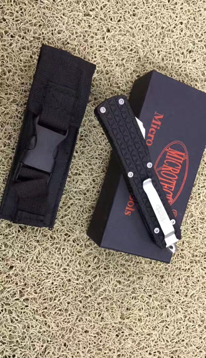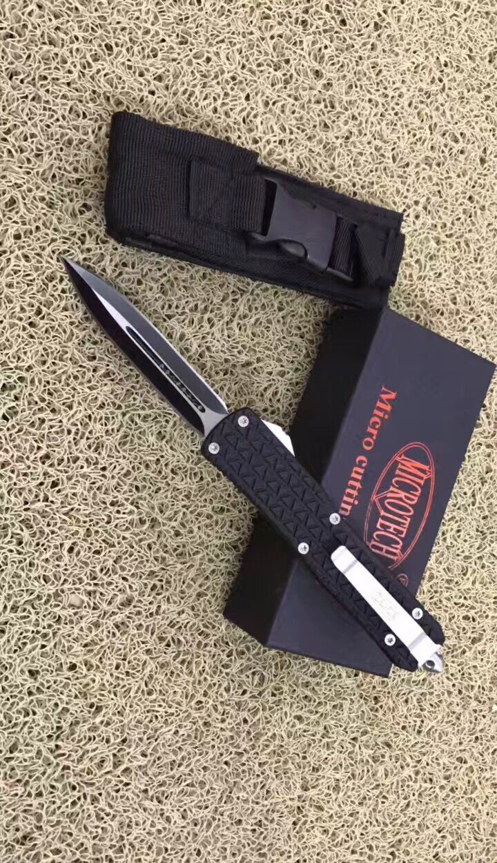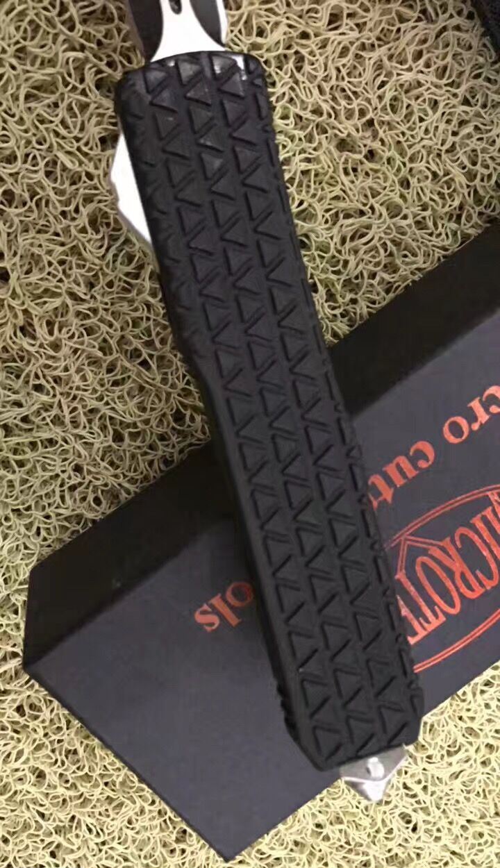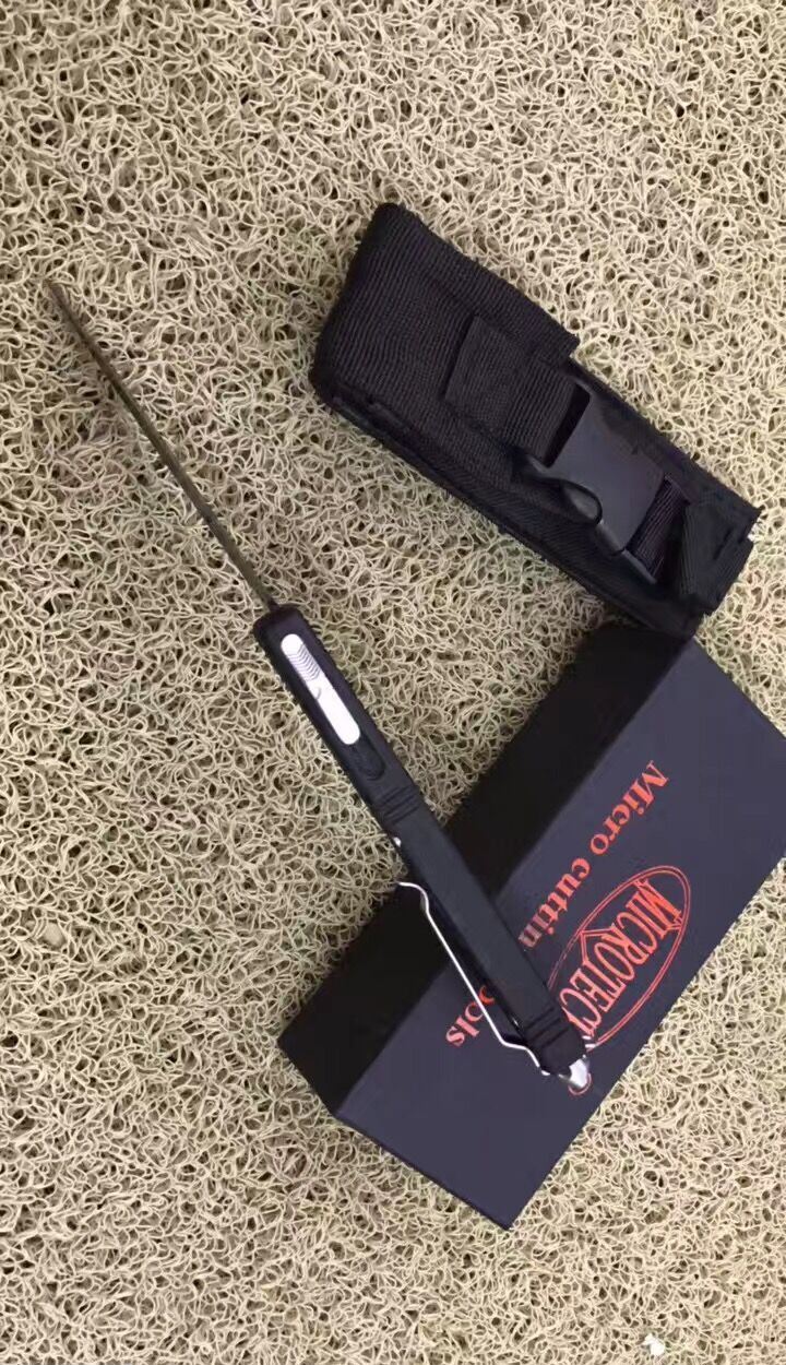 新款微技术伤齿龙C9双锋直跳刀 全 长:23.0cm (含尾锥长度) 刃 长:9.0cm 刃 厚:3mm 刃 材:440 硬 度:57HRC 刀净重:230.0克 总重量:350.0克(含包装物) 表 面:灰钛(刀刃) 柄 材:锌铝合金 刀 鞘:尼龙 锁 闭:弹簧直出 备 注:带背夹和玻璃撞针
