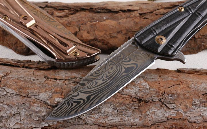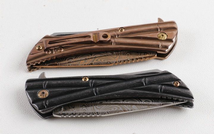 微技术终结者仿大马士革纹折刀 全长:22.2cm 刃长:9.5cm 柄长:12.8cm 刃厚:0.39cm 刃宽:2.8cm 刃材:5CR15MOV 柄材:全钢片 硬度:57HRC 净重:260克(含包装) 锁定:线锁 表面处:钛金色+彩钛两款任选,下单注明 其他:原厂灰盒
