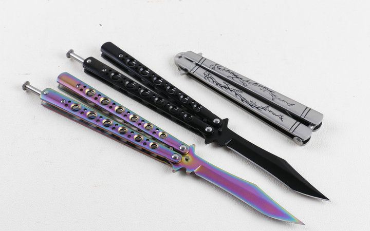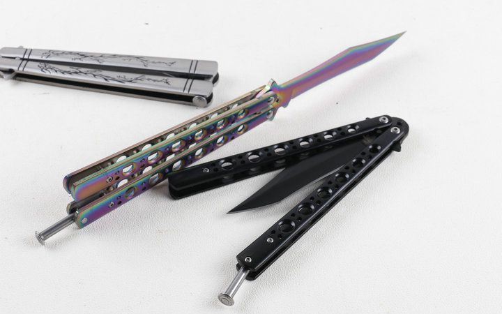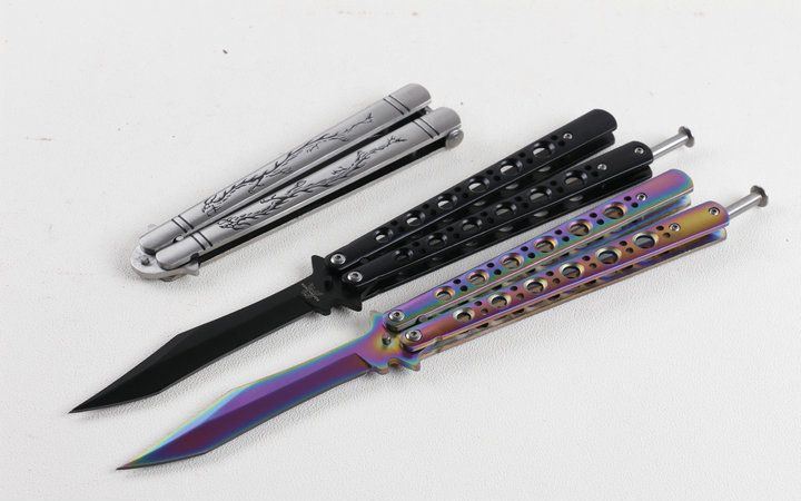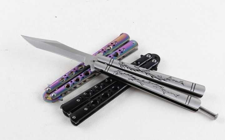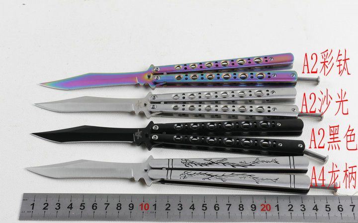 蝴蝶A2A4甩刀(四款式) 全 长:23.5cm 刃 长:10cm 柄 长:13.5cm 刃 宽:1.8cm(最宽处) 刃 厚:2.8mm 刃 材:440C 硬 度:56HRC 刀 柄:钢柄 表 面:砂光 重 量:195.0克(含包装) 配尼龙袋,原厂包装 其 它:本产品分A2黑色,彩钛,沙光,A4龙柄,下单请注明