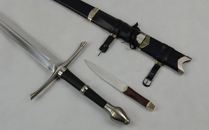 魔戒骑士剑 全长:1290MM 刃长:900MM 刃厚:5.0MM 刀刃材质:2cr13 不锈钢,钝刃 柄长:270mm 手柄材质:护手与柄头是锌合金镀古银;柄握手是锌合金外包皮 每箱尺码:133*31*10cm 每箱重量:净重:2.35KGS / 毛重:3.25KGS 装 箱 率:1把/件 用途:装饰摆设,镇宅避邪,收藏观赏 描述:剑鞘上配有一把双铜头小直刀,全长:26.8cm,刃长:16cm, 柄长:10.6cm,刃材:2CR13,柄材:铜头+木,备注:不开刃