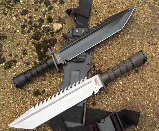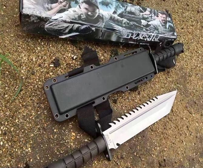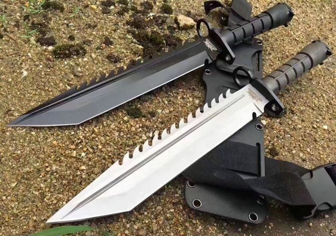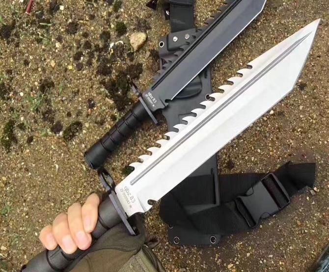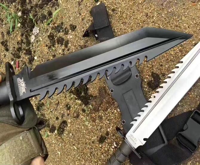 战狼军用刀加长版(白色、黑色) 全长:42.5CM 刃长:29.7CM 柄长:12.8CM 身最大宽度:4.8CM 刀厚:0.58CM 刃面:喷砂 毛重:884克(含k鞘) 钢材:7CR15钢 硬度:57 刀柄:绝缘强化塑胶