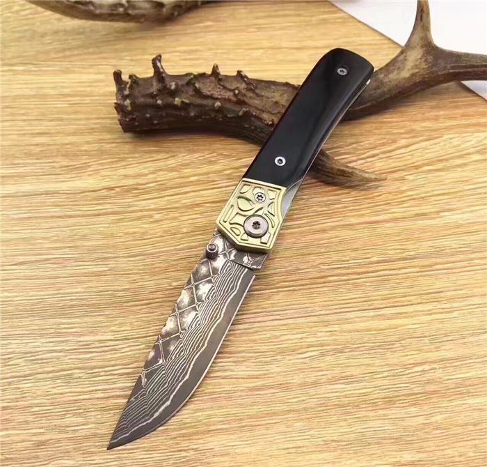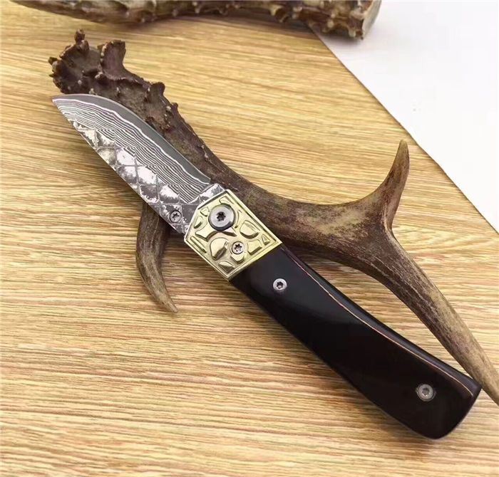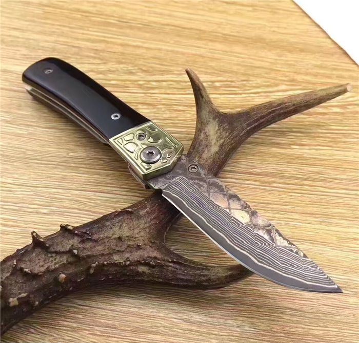 大马士革牛骨柄迷你折刀 全长:16CM 刃宽:1.8CM 刃长:7CM 刃厚:2mm 刃材:大马士革 重量:黑56g 硬度:58HRC 柄材:黑柄牛角+铜头 配送:礼品盒