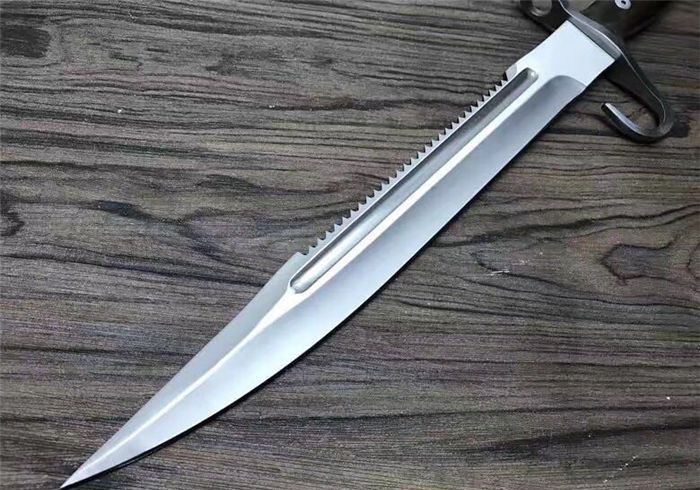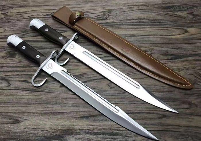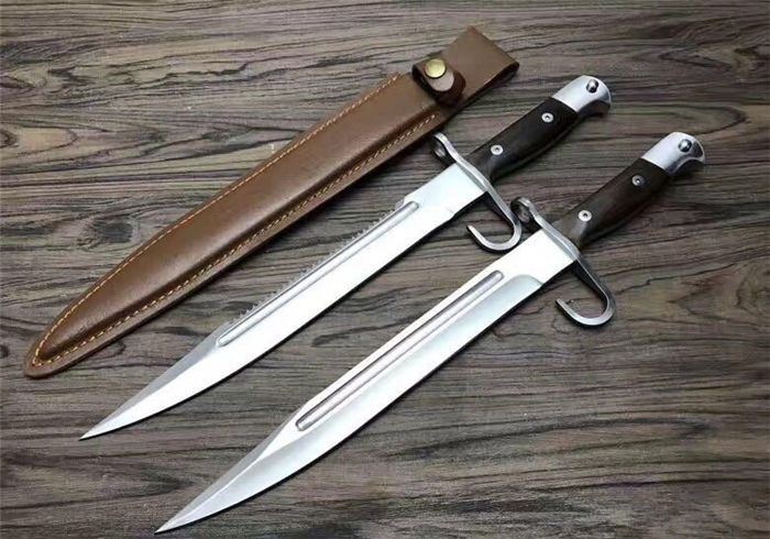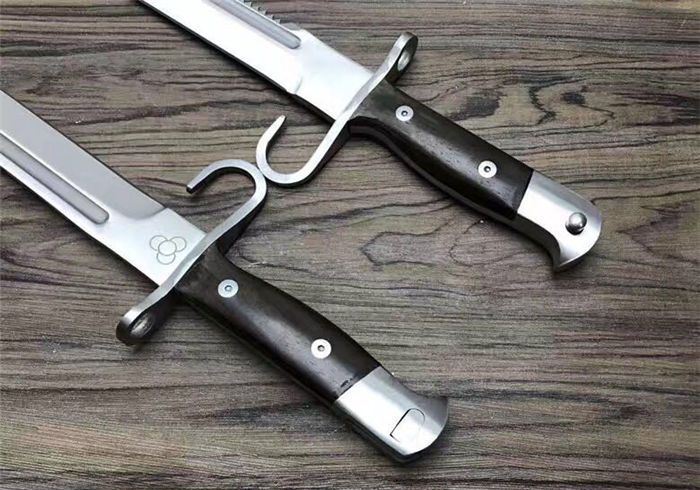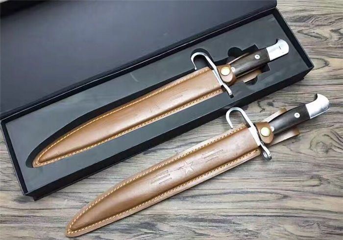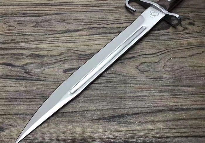 短版德国军刺 全 长:41.5cm 刃 长:29.5cm 柄 长:12cm 刃 宽:3.1cm(最宽处) 刃 厚:6.4mm 刃 材:5CR13MOV 硬 度:56-58HRC 刀 柄:加厚钢尾,护手和酸枝木组成 表 面: 沙光 重 量:980克(含包装) 备 注:原厂礼品盒,优质皮套