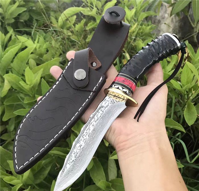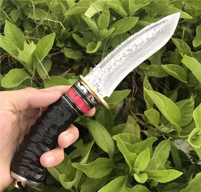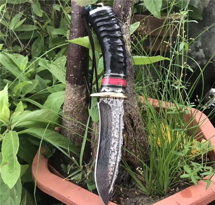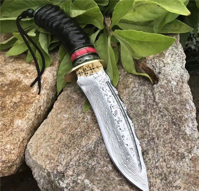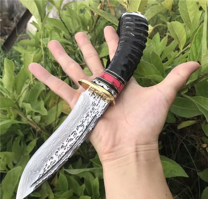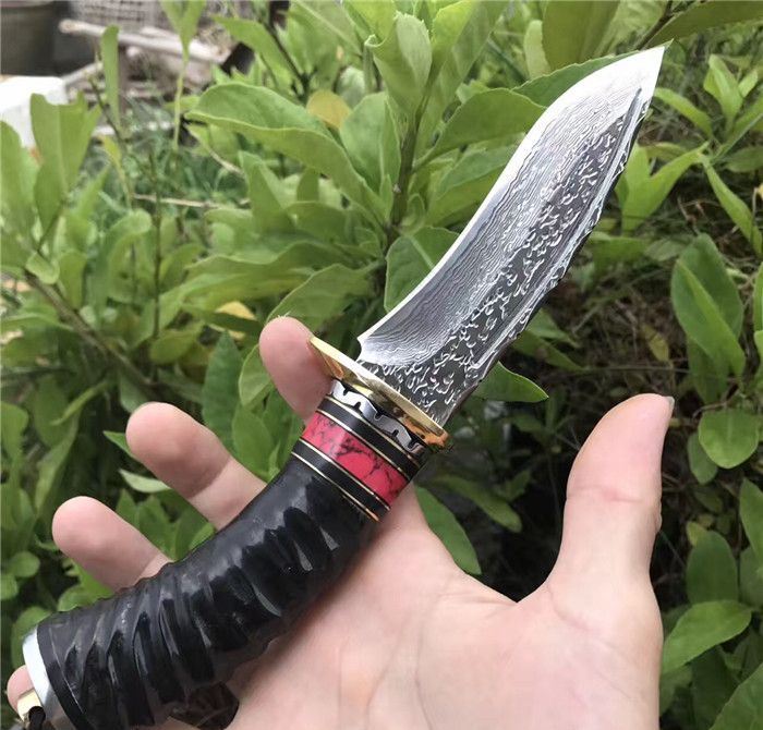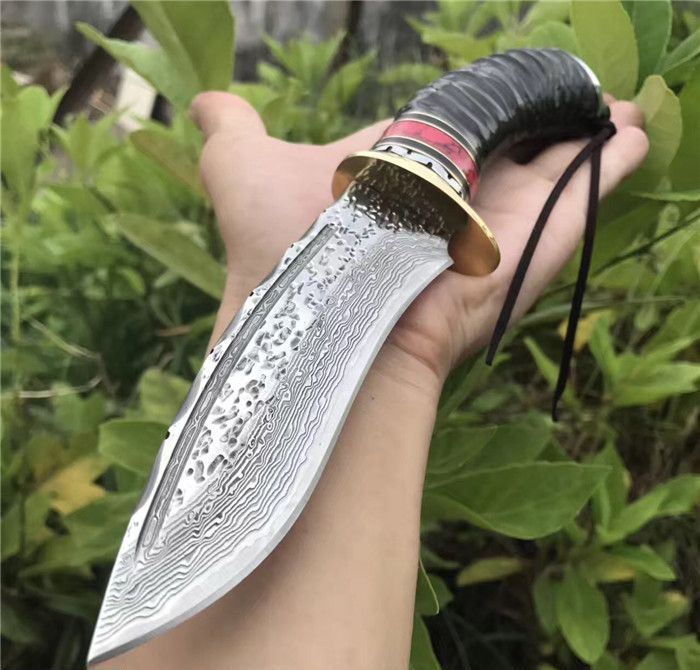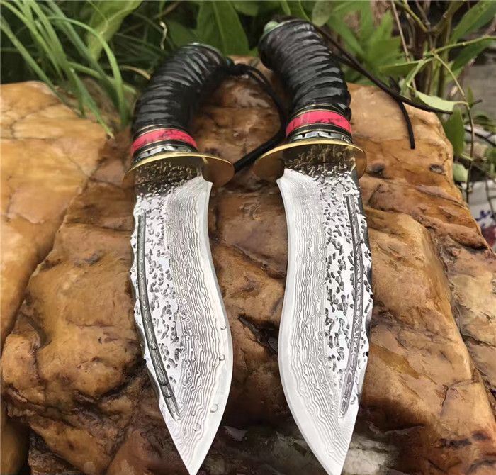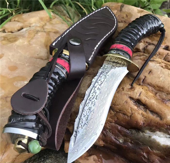 大马士革黑鹰挑战者猎刀 全 长: 24.3cm 刃 长: 12.8cm 柄 长: 11.5cm 刃 厚: 4.5mm 刃 宽: 3.2cm 刃 材: 进口Vg10大马士革 硬 度: 60HRC 重 量: 约300克(含包装) 表 面: 锻打凹凸大马士革祥云纹原色 柄 材: 天然黄羊角+黄铜+G10+红彩石+钢雕花 配 送:高级礼品盒+原装皮套+牛皮绳+彩珠